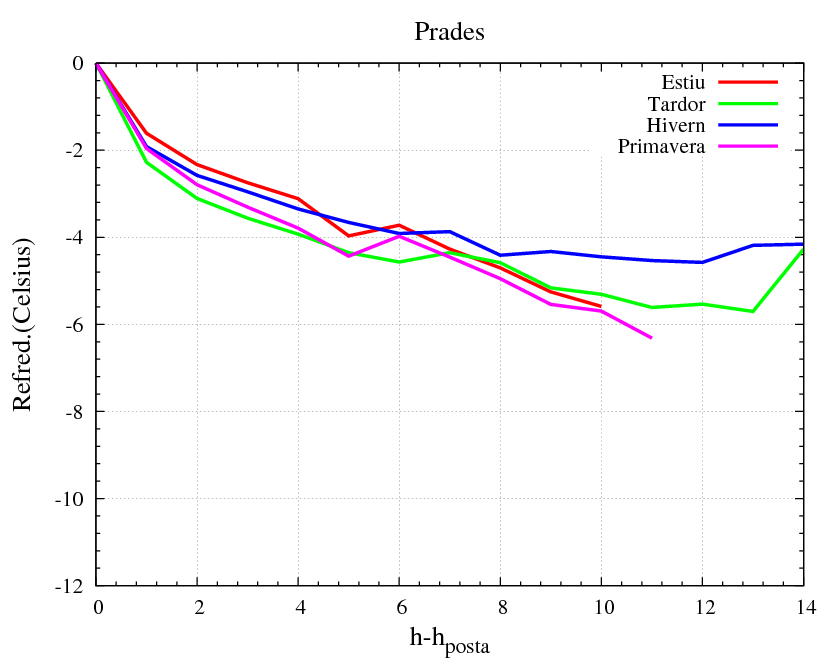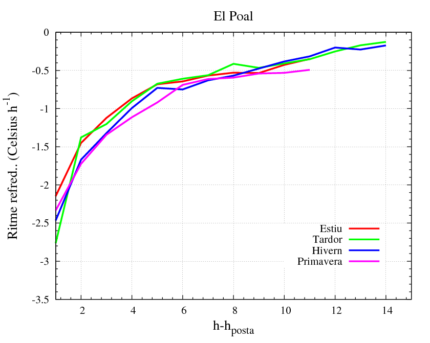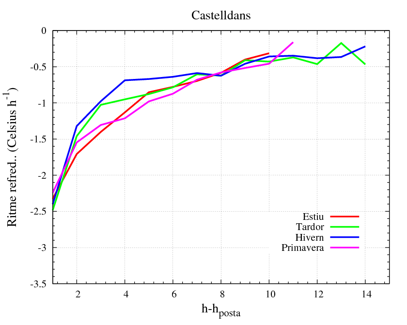 Mitjanes dels refredaments, dels ritmes de refredaments i de l'evolució del mòdul de la velocitat del vent durant les nits estables