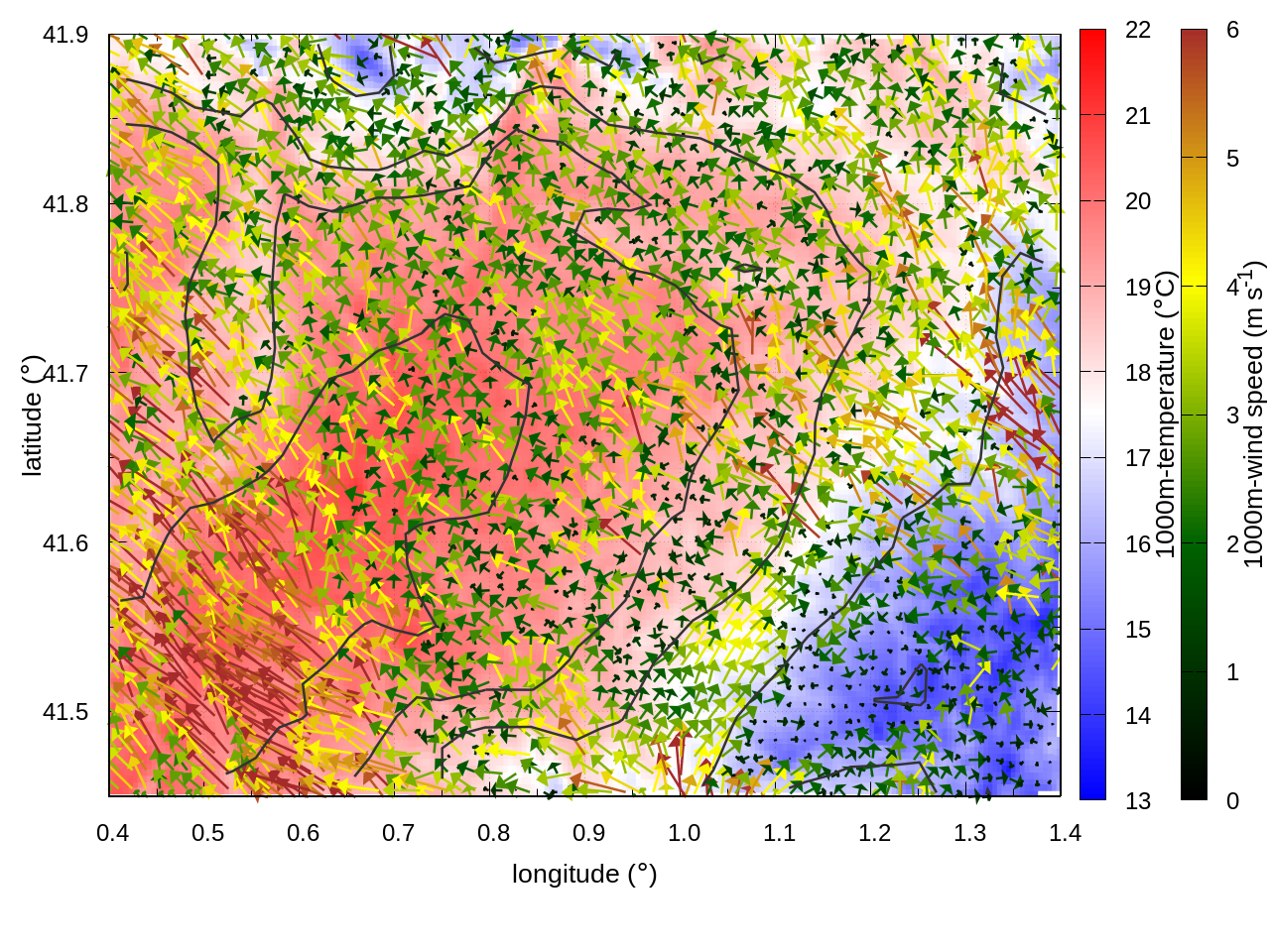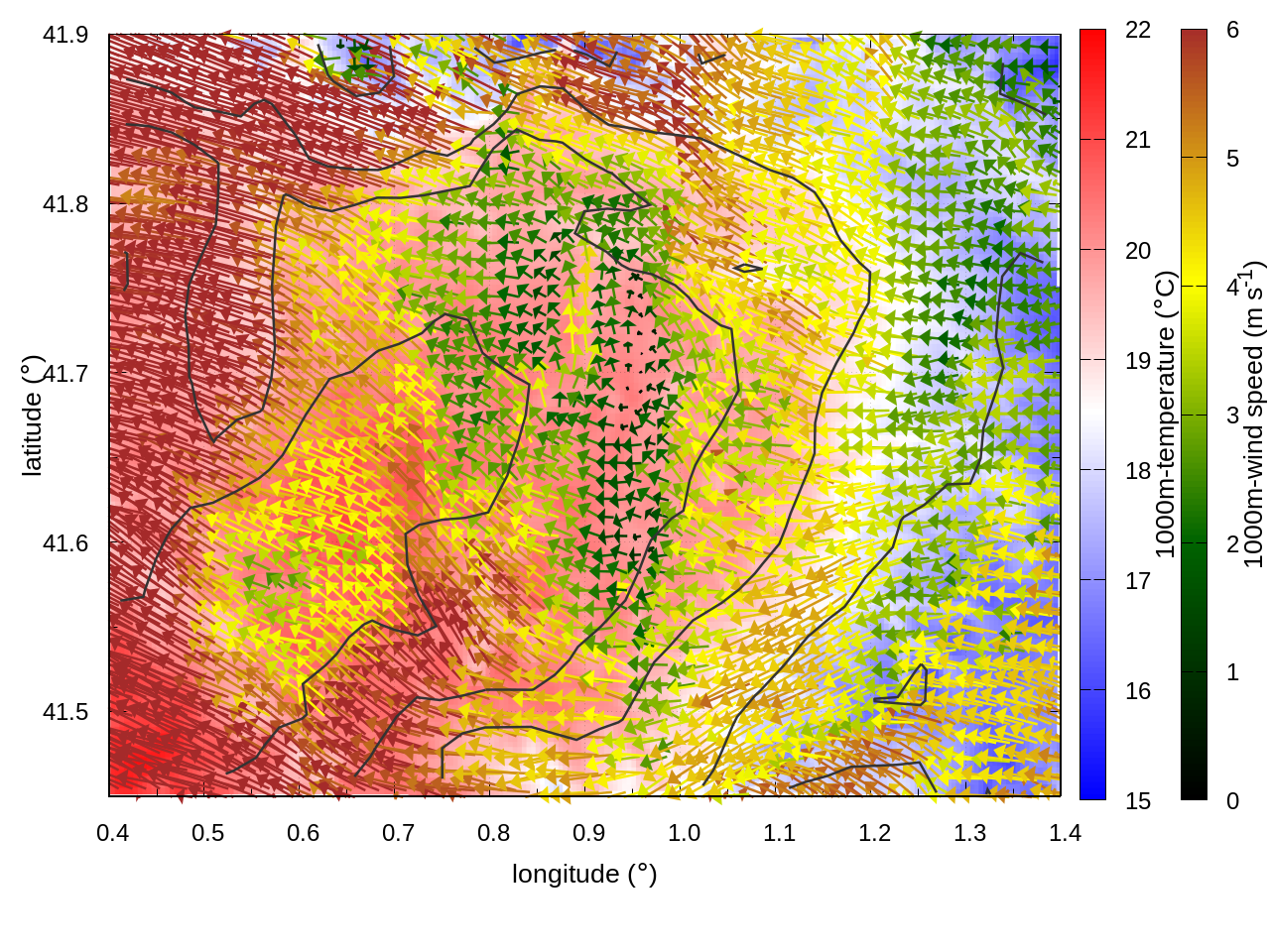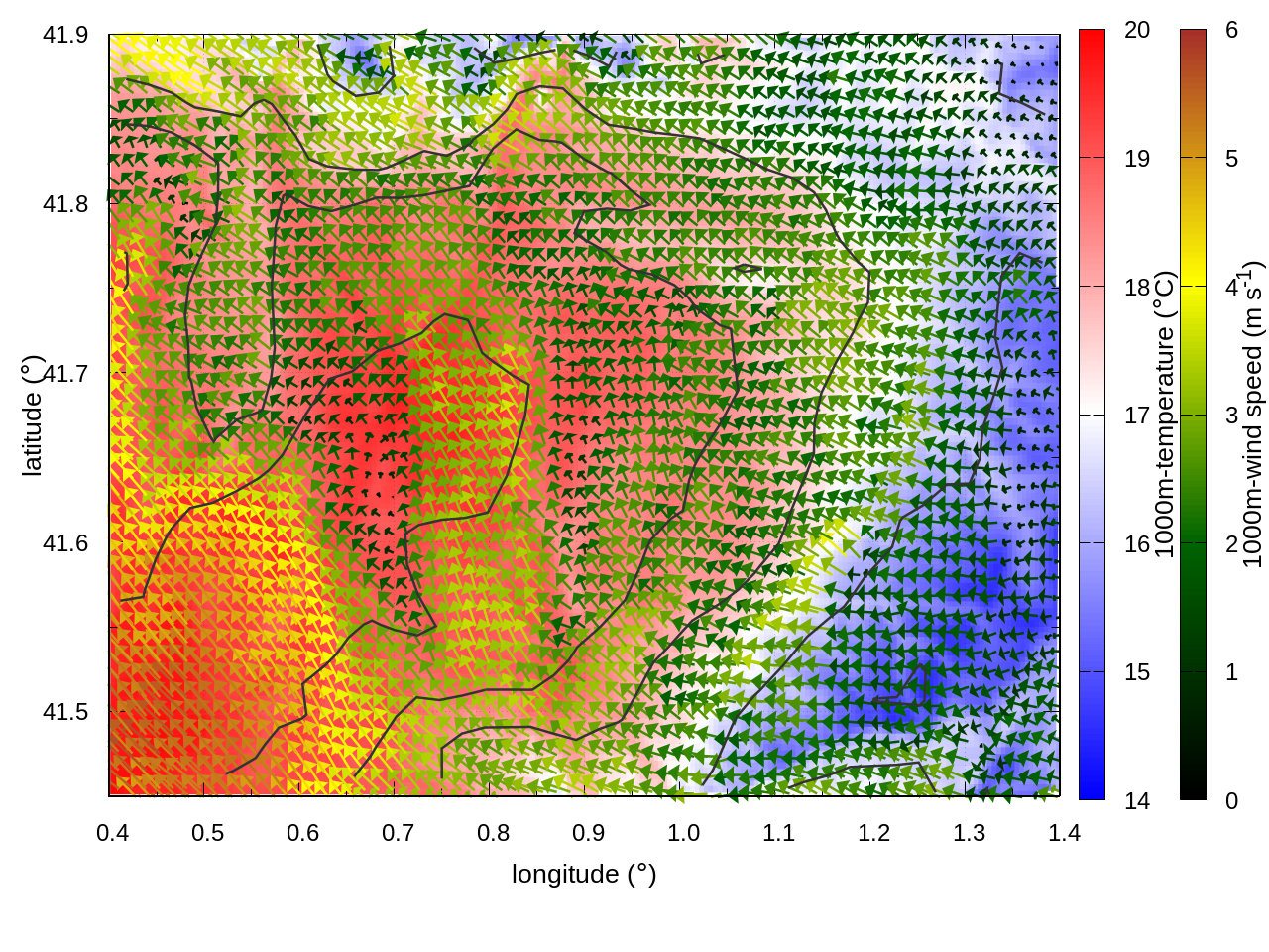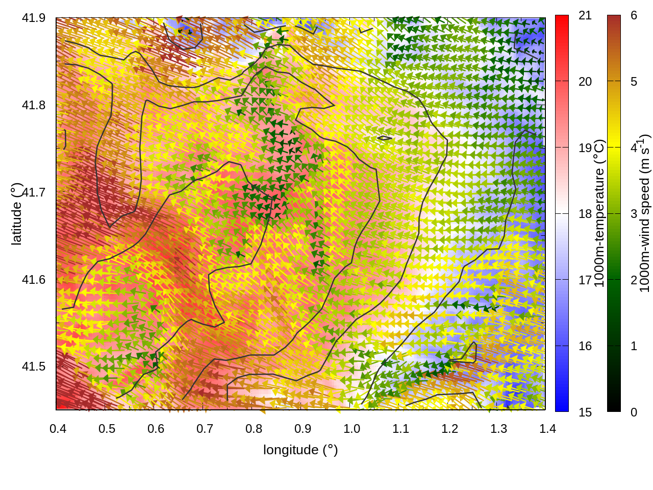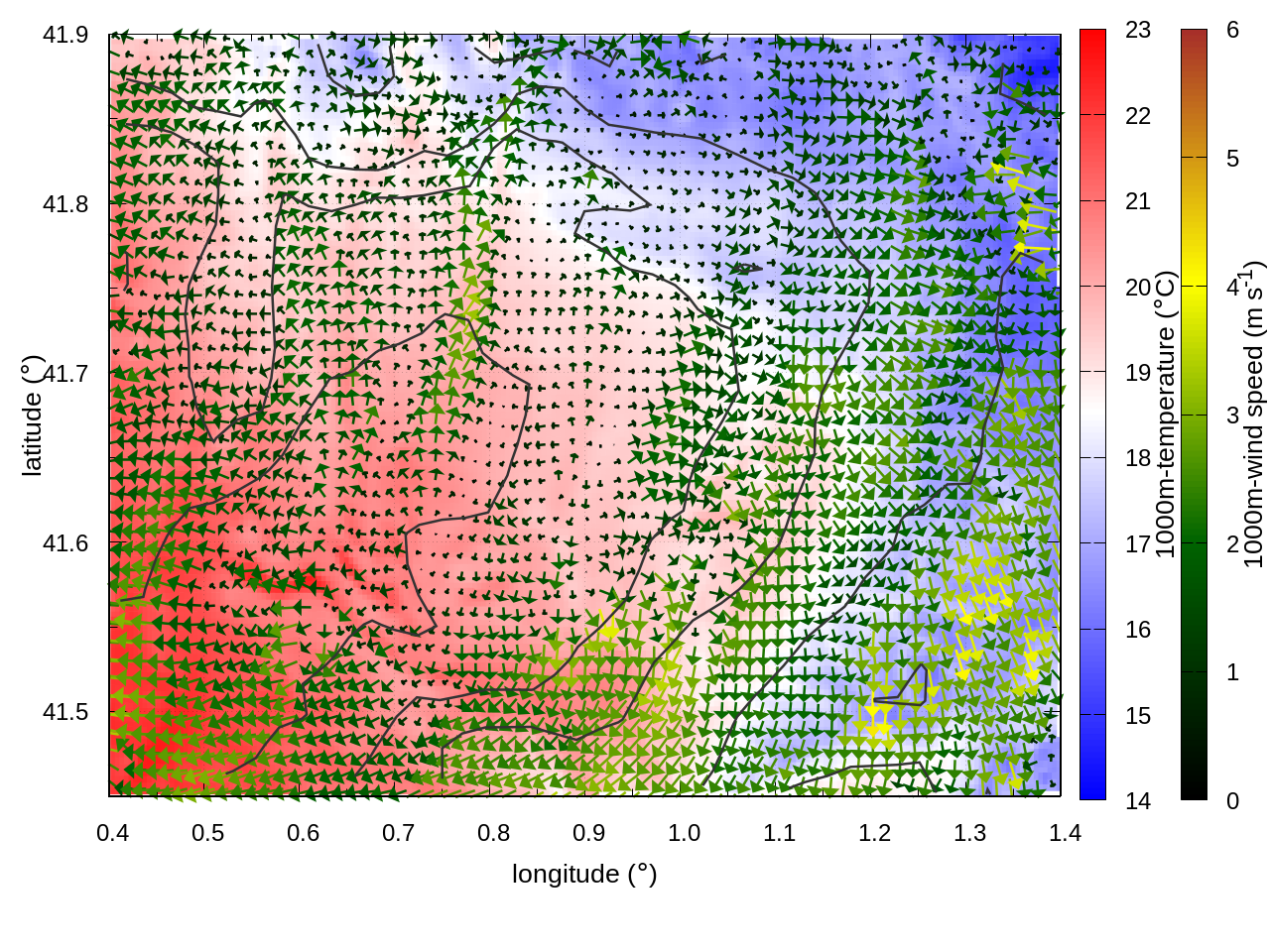 RIGHT: zoom over the region of interest (1 arrow every 3 gridpoints, about 1.2km x 1.2 km resolution)