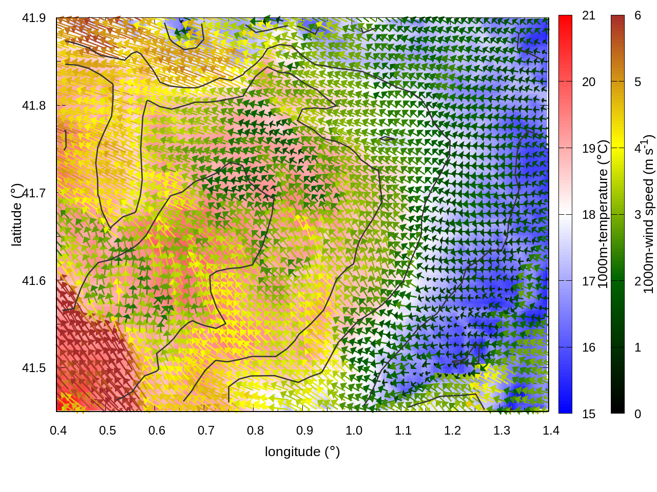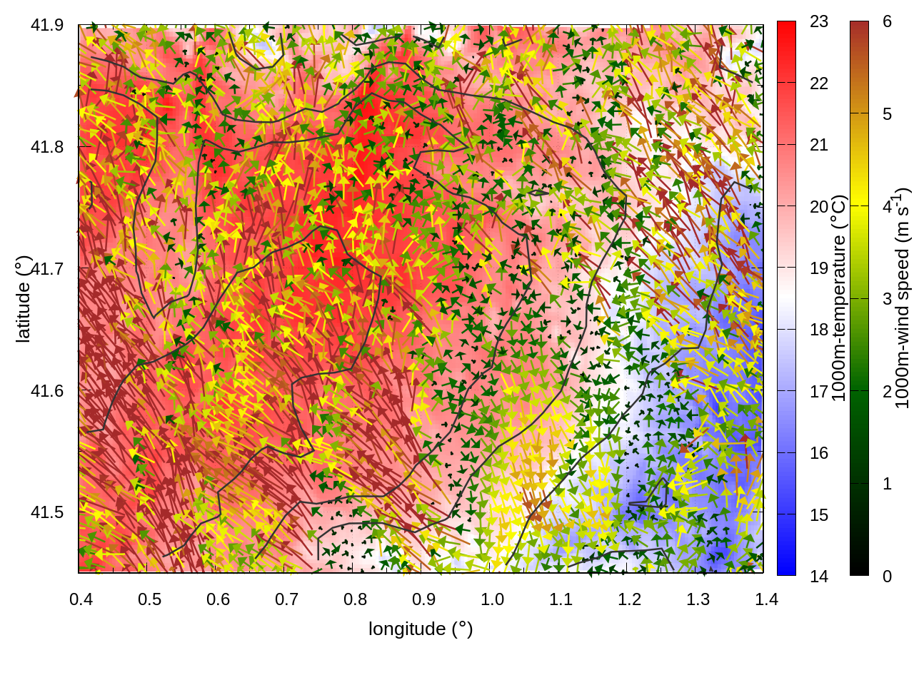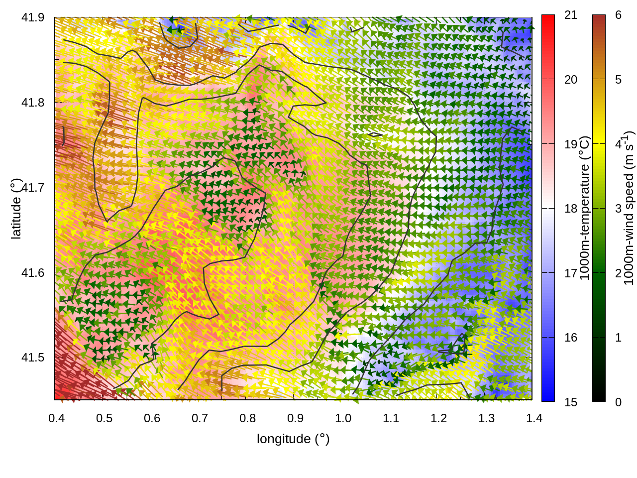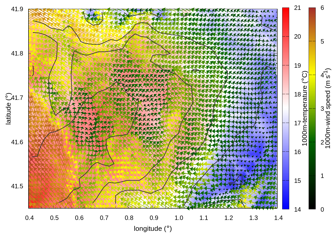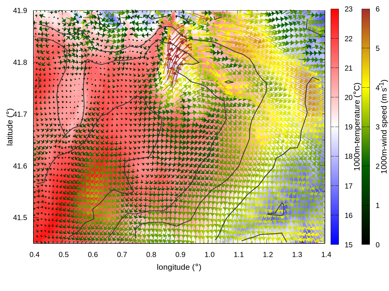 RIGHT: zoom over the region of interest (1 arrow every 3 gridpoints, about 1.2km x 1.2 km resolution)