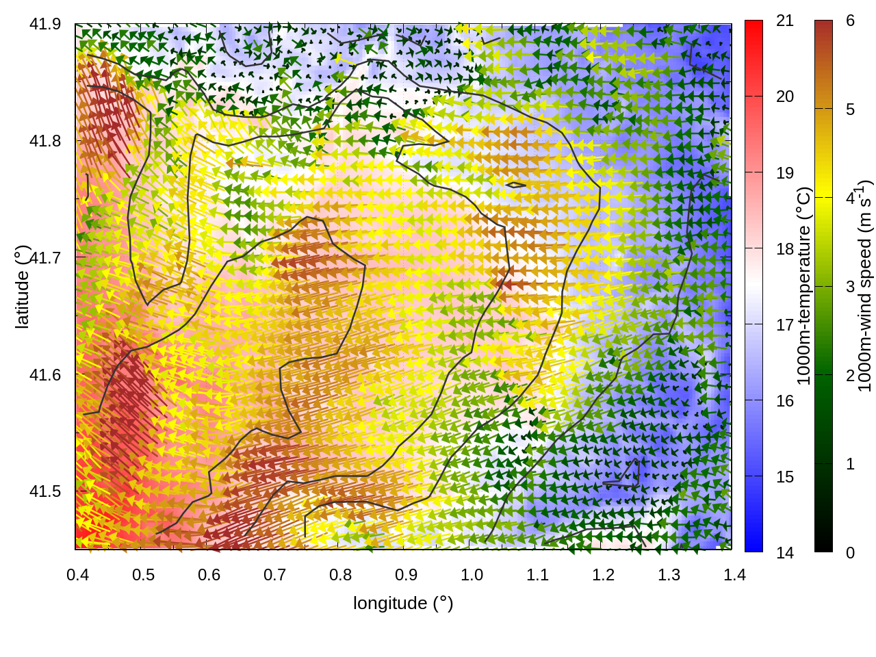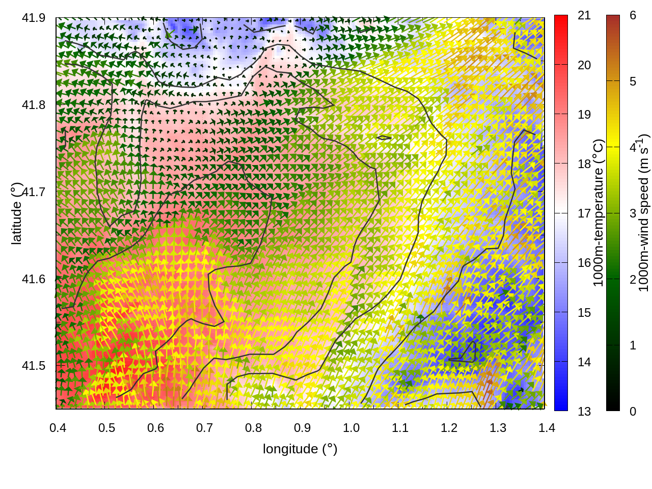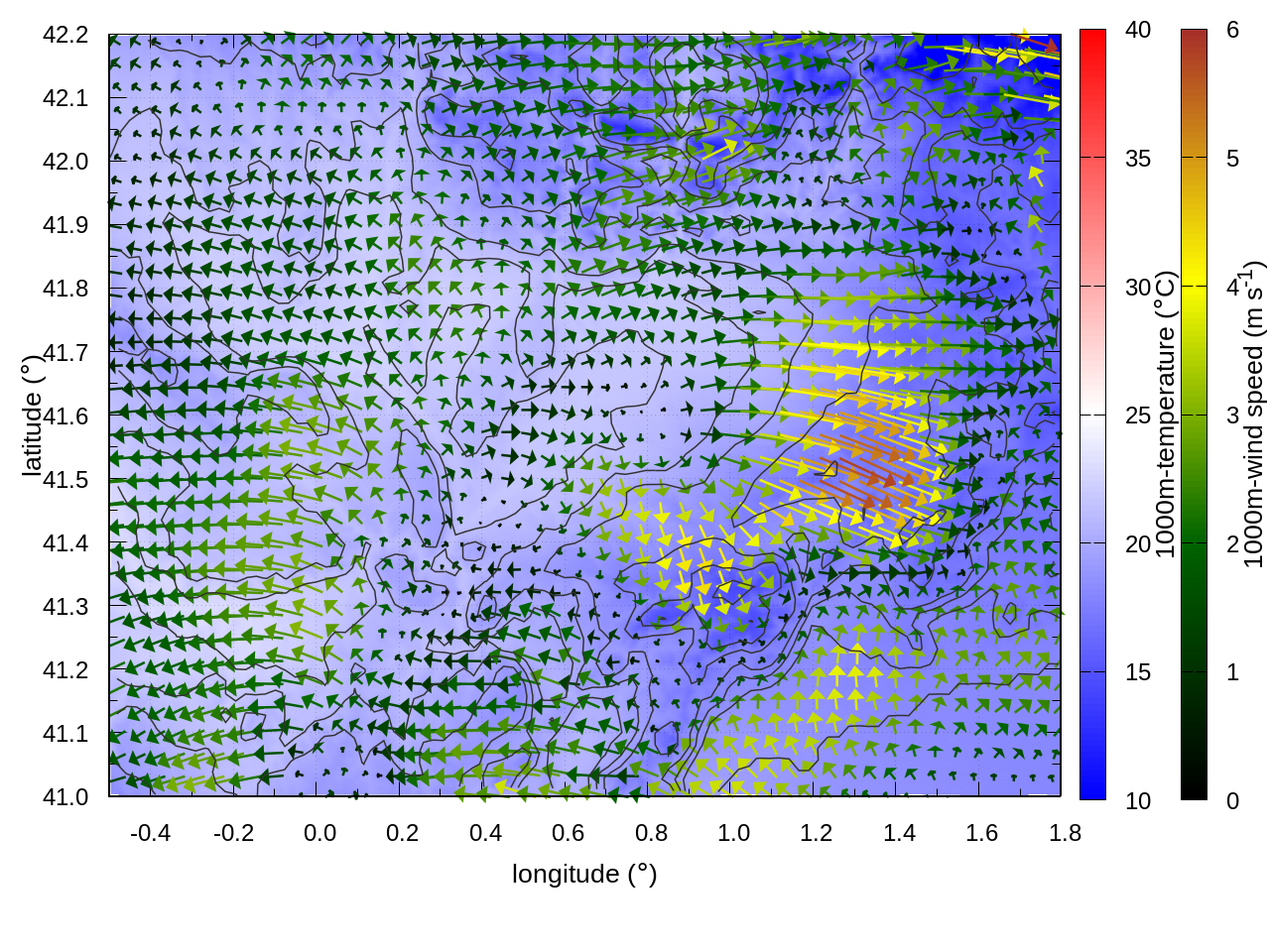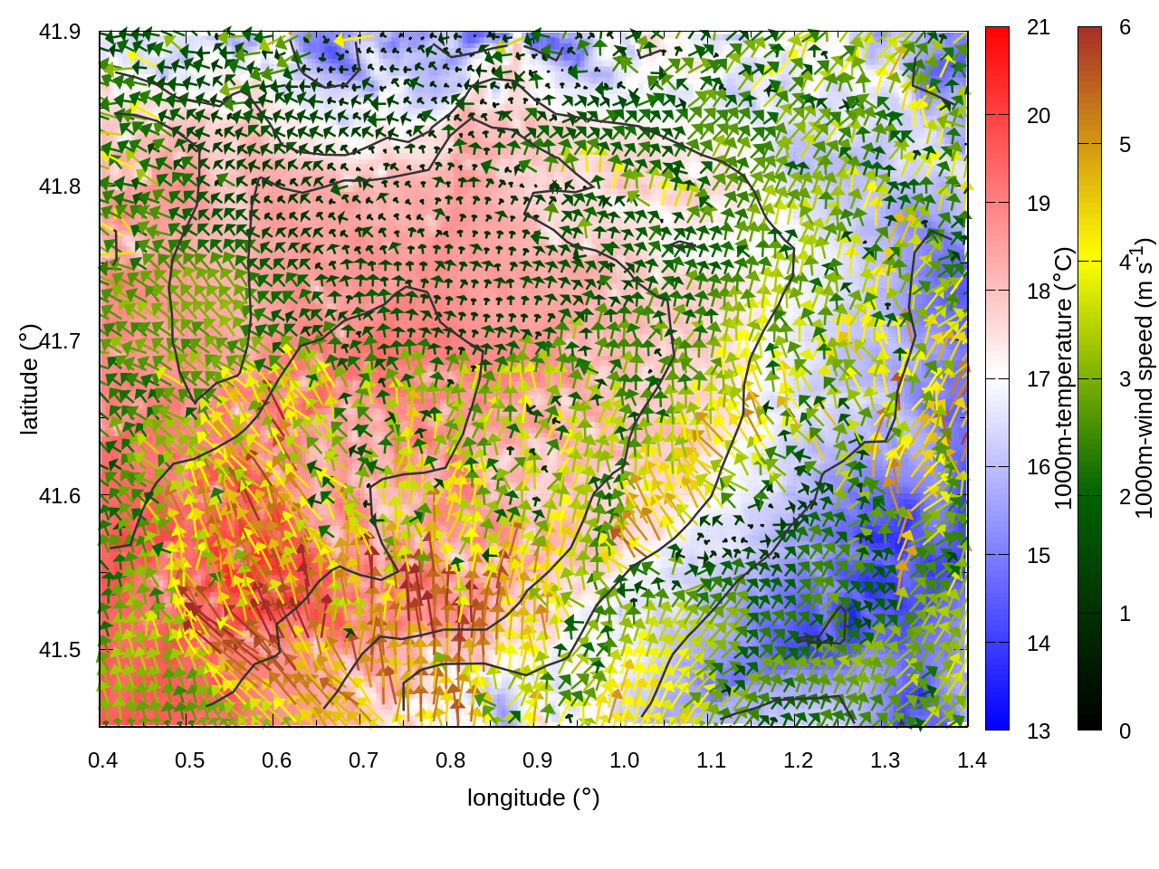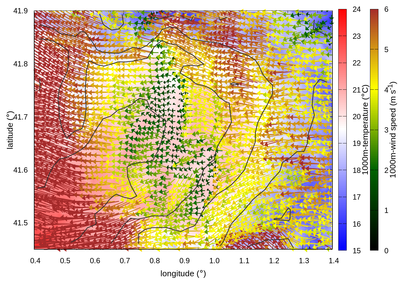 RIGHT: zoom over the region of interest (1 arrow every 3 gridpoints, about 1.2km x 1.2 km resolution)