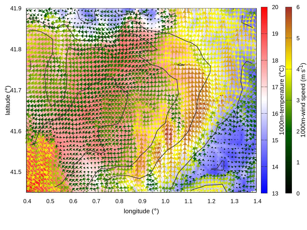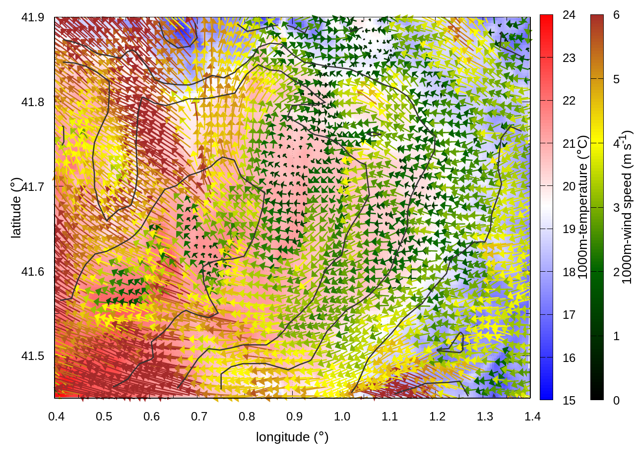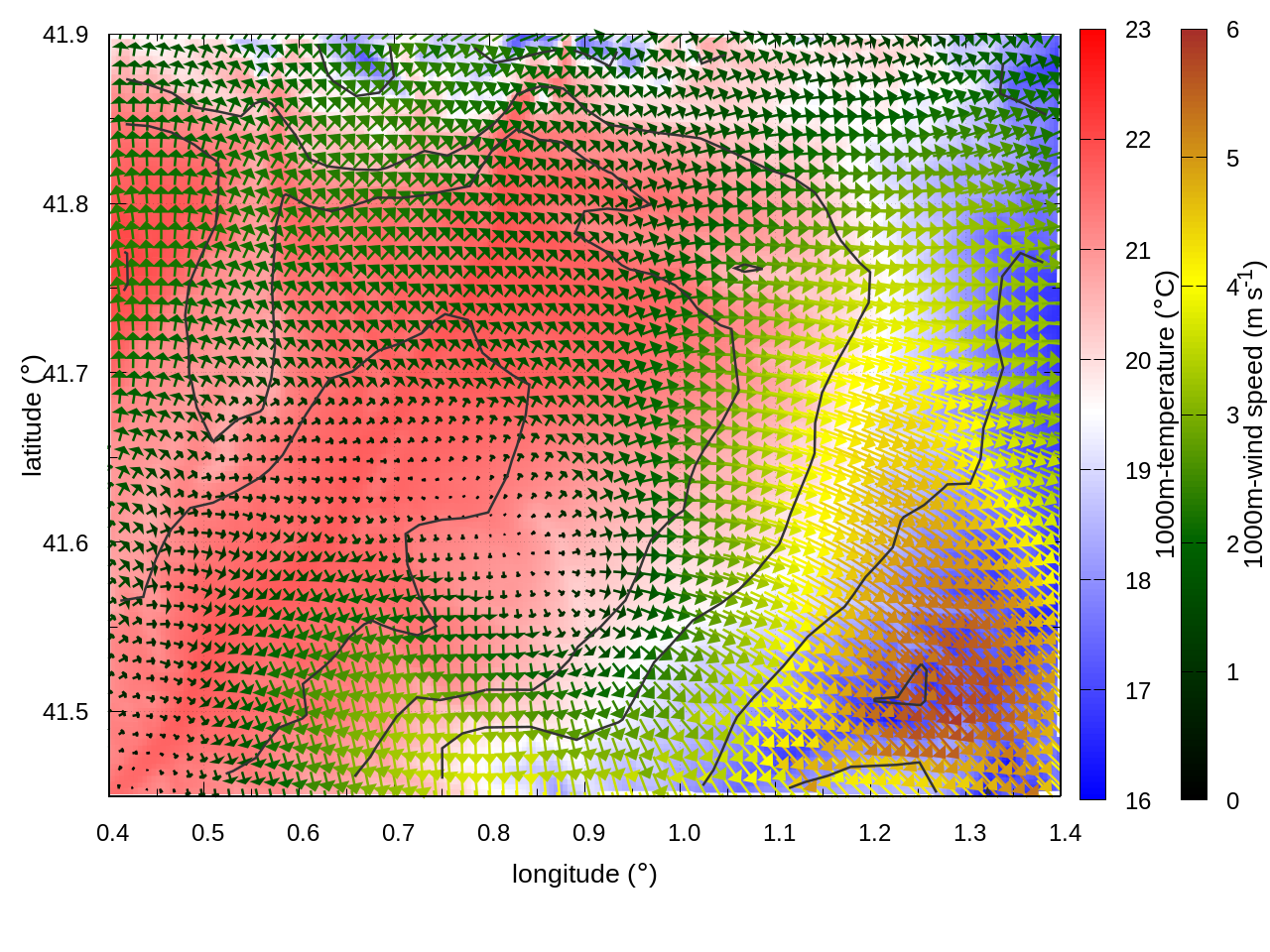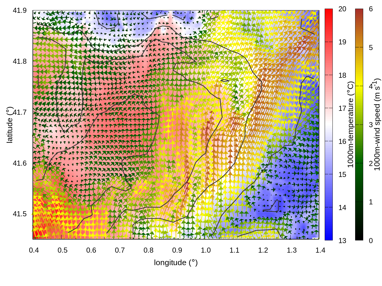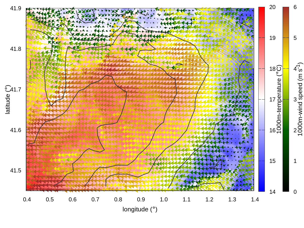 RIGHT: zoom over the region of interest (1 arrow every 3 gridpoints, about 1.2km x 1.2 km resolution)