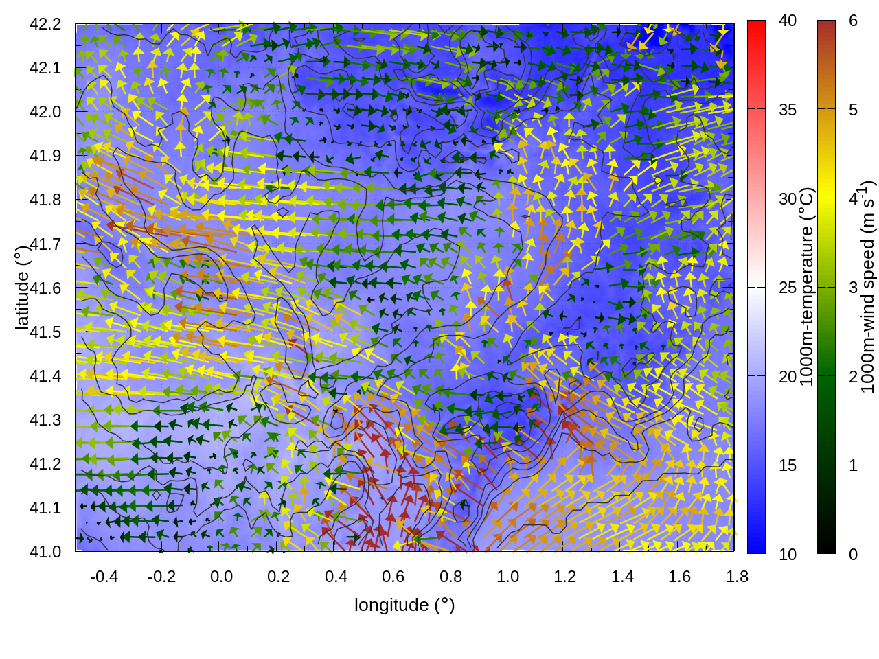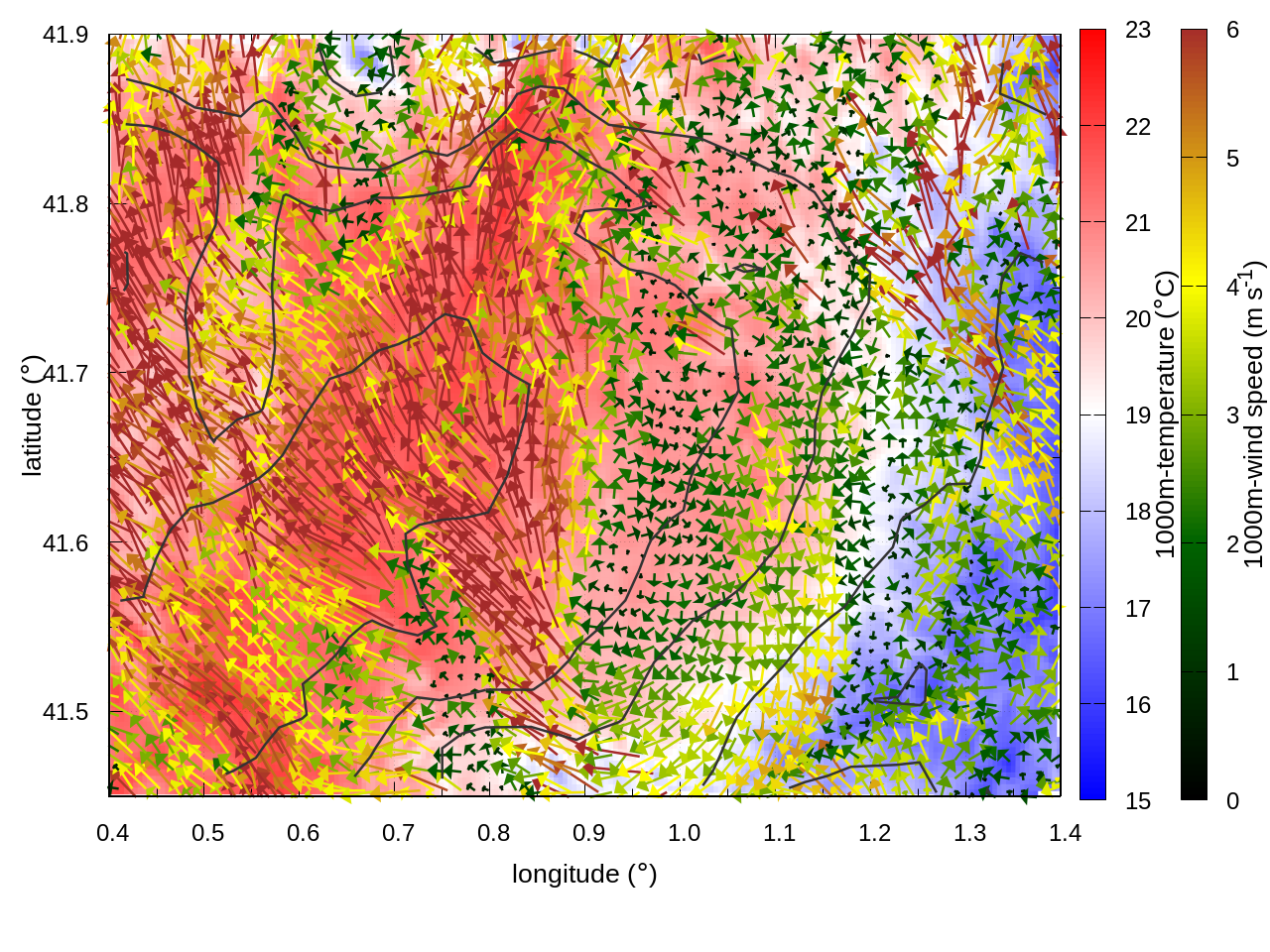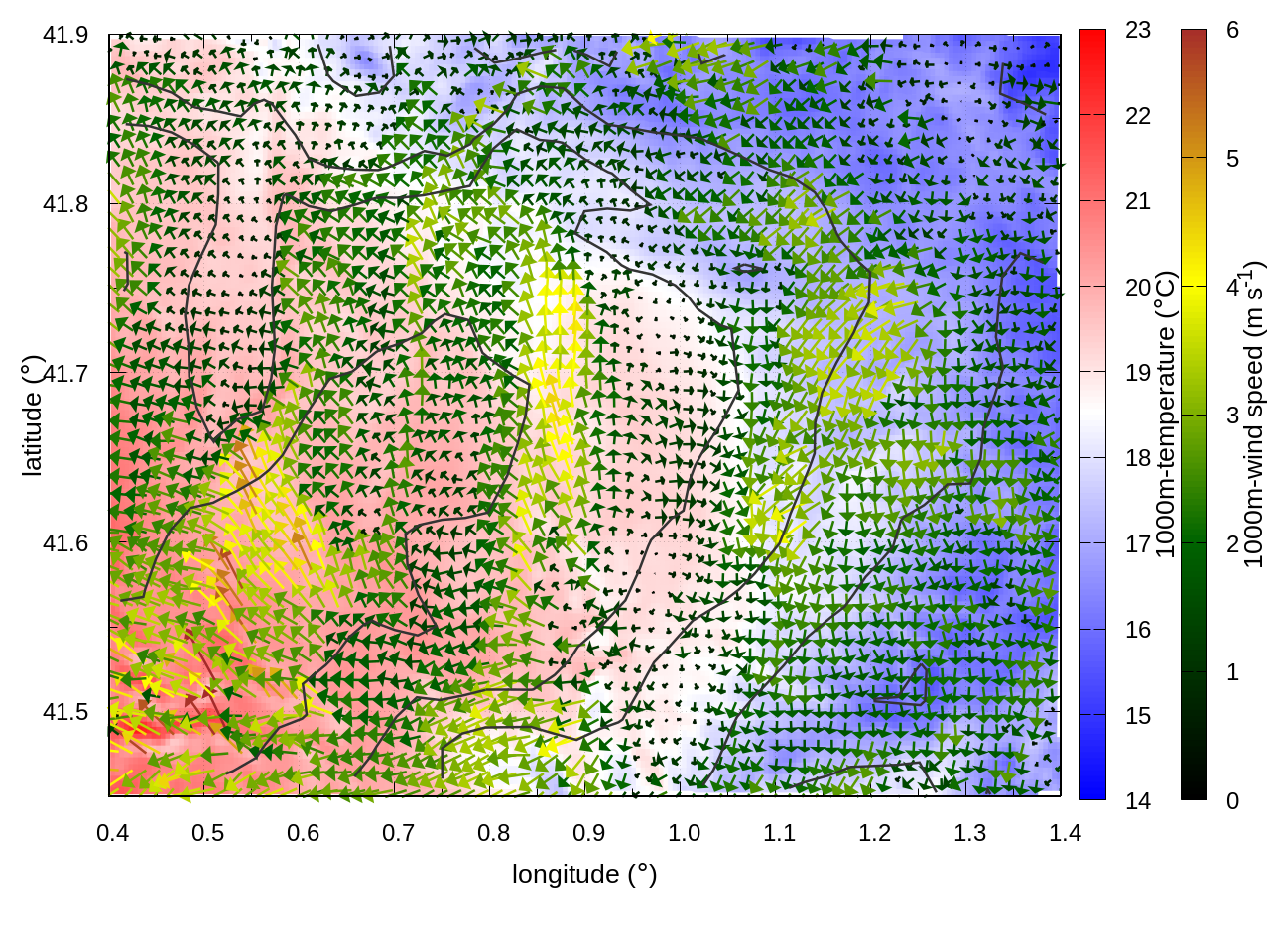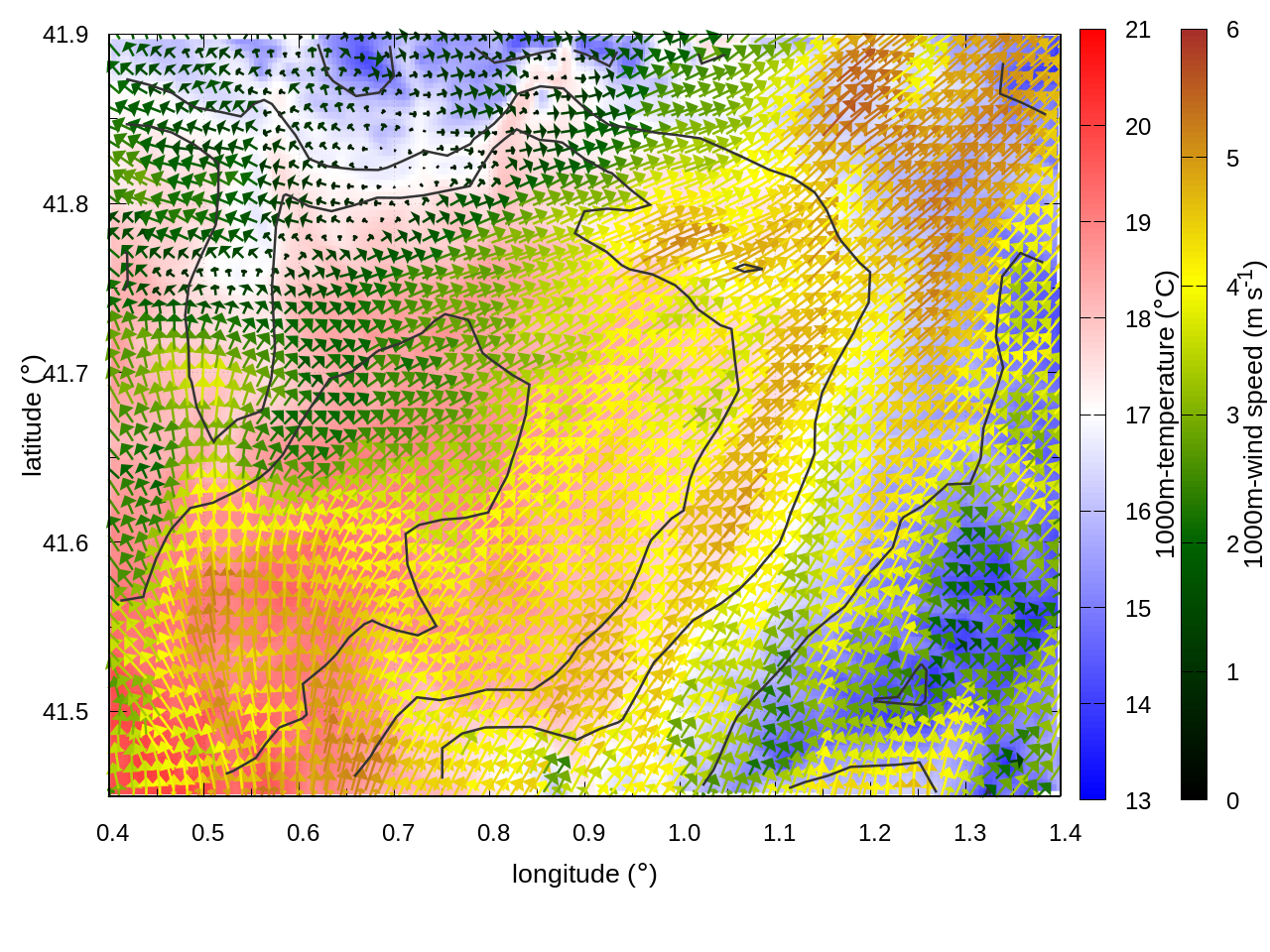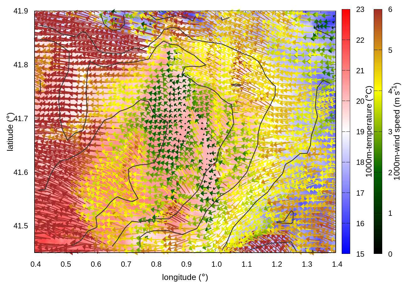 RIGHT: zoom over the region of interest (1 arrow every 3 gridpoints, about 1.2km x 1.2 km resolution)