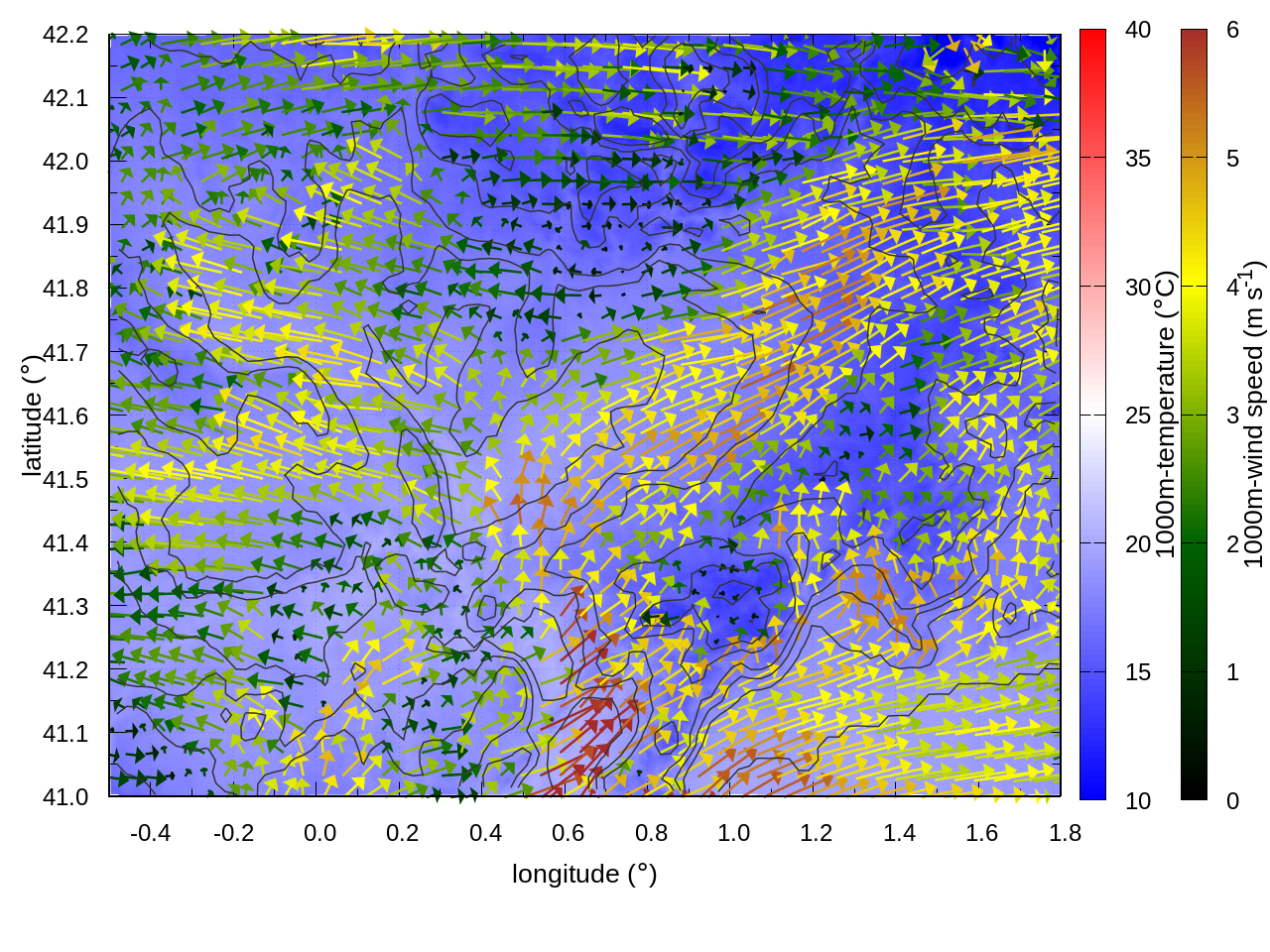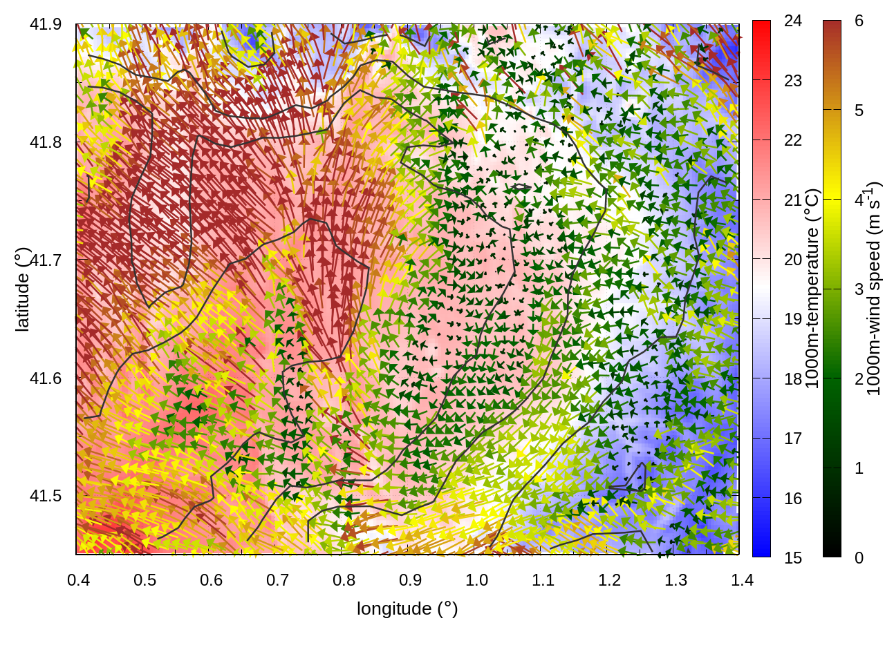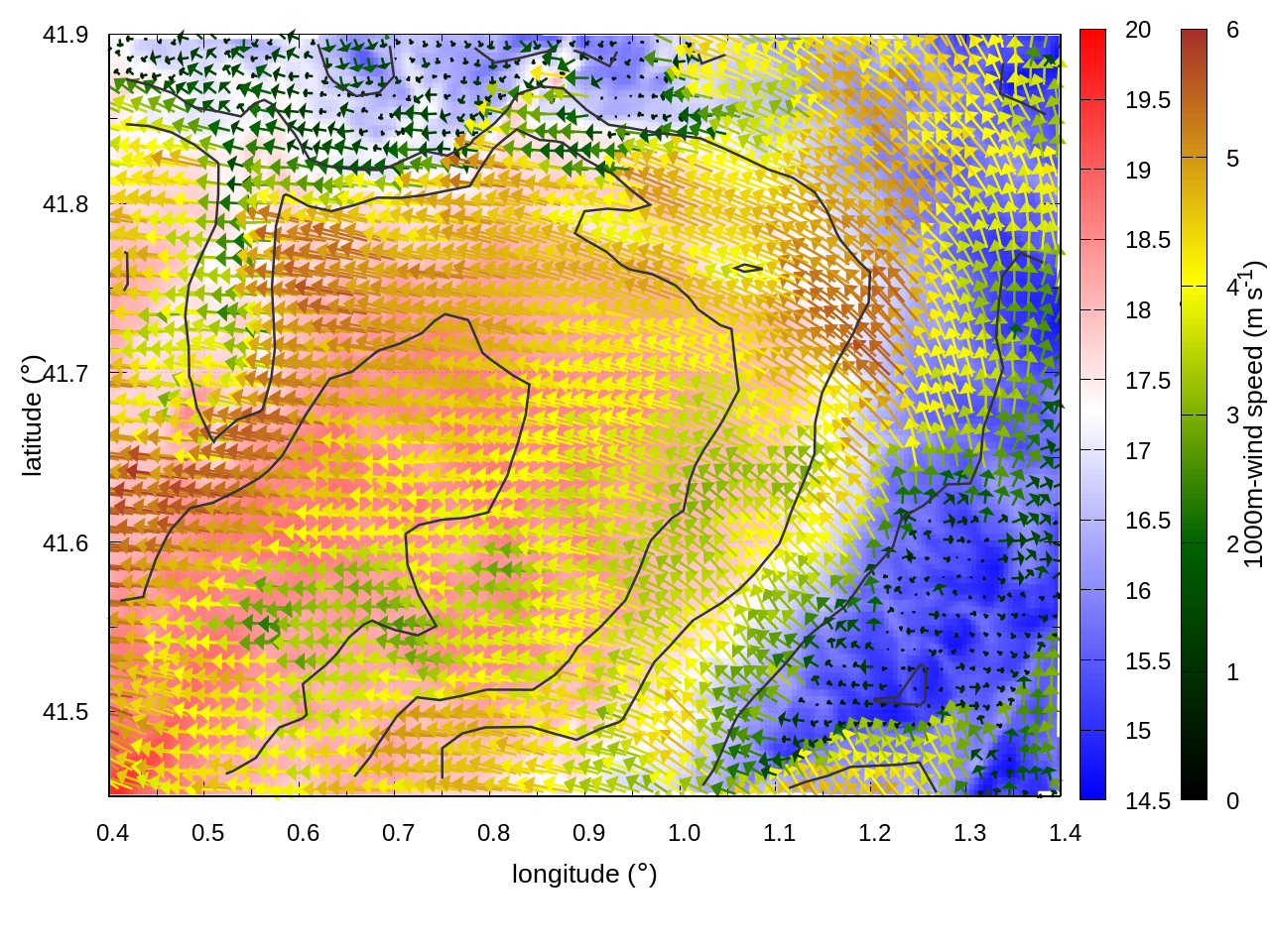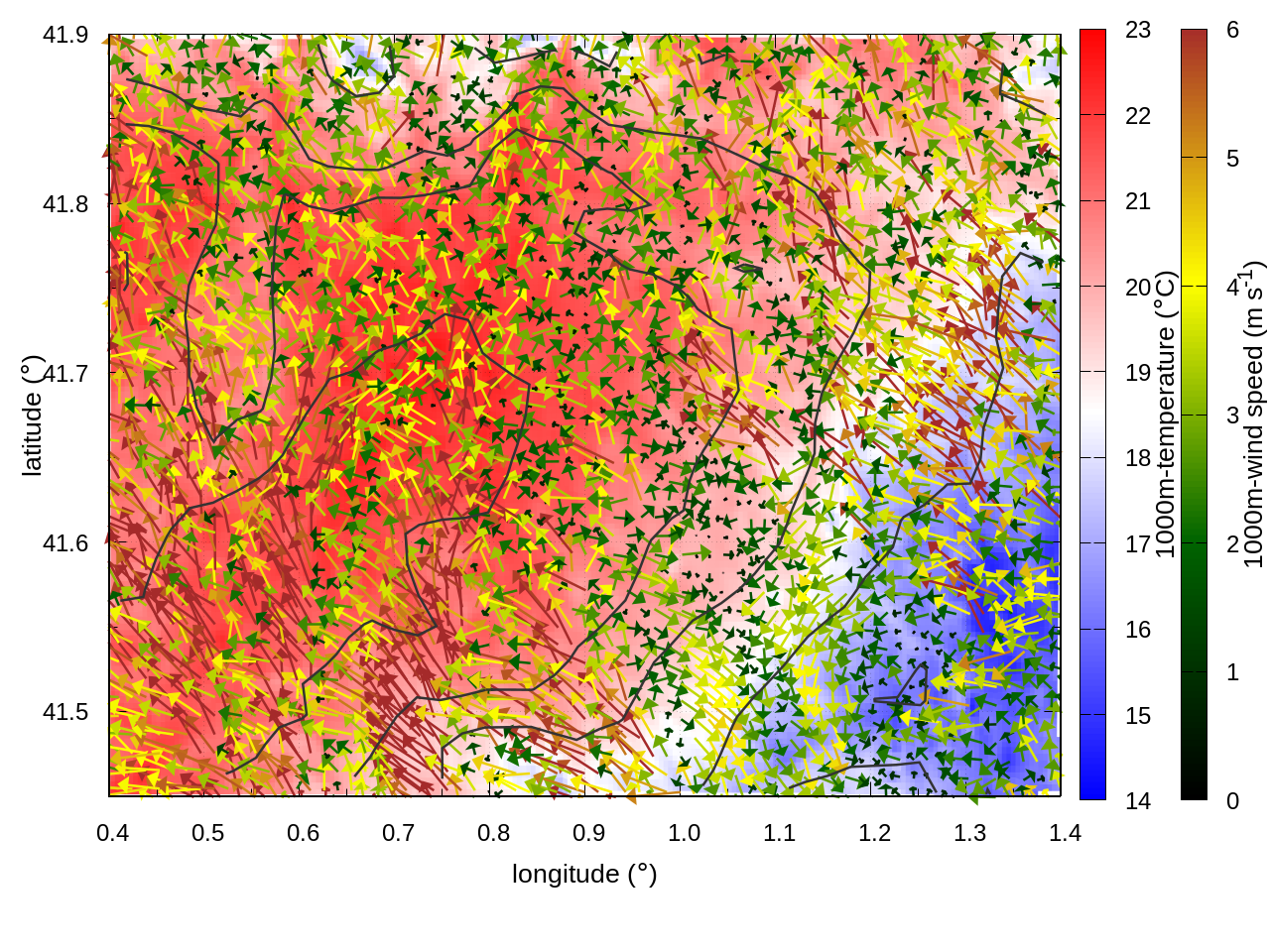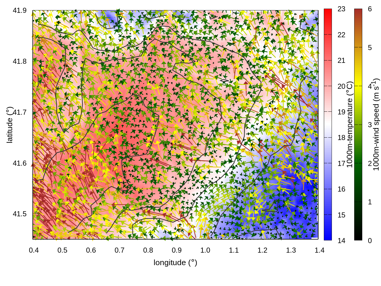RIGHT: zoom over the region of interest (1 arrow every 3 gridpoints, about 1.2km x 1.2 km resolution)