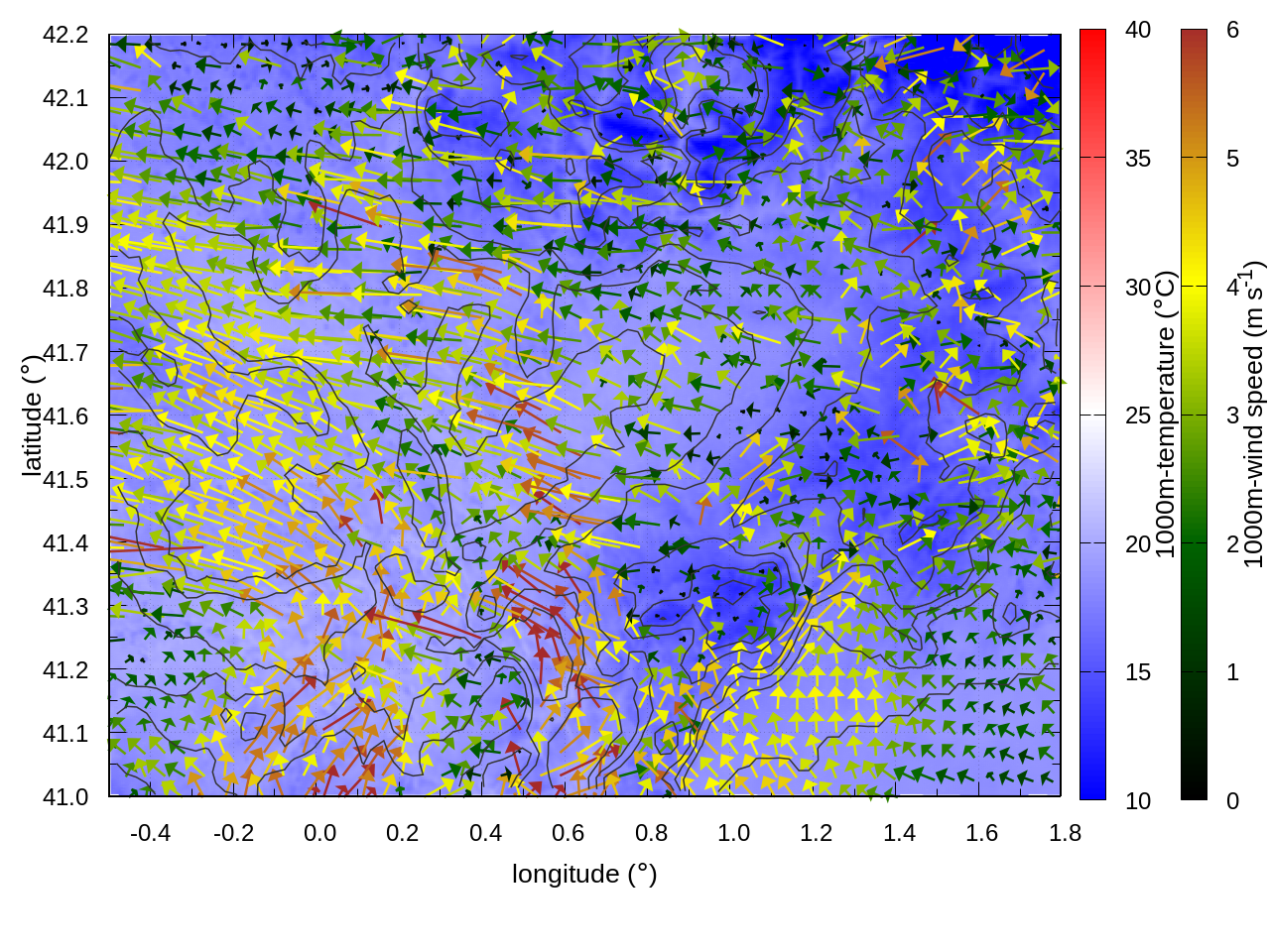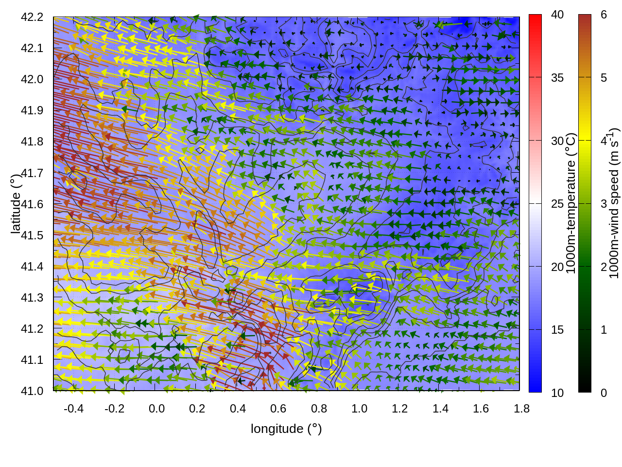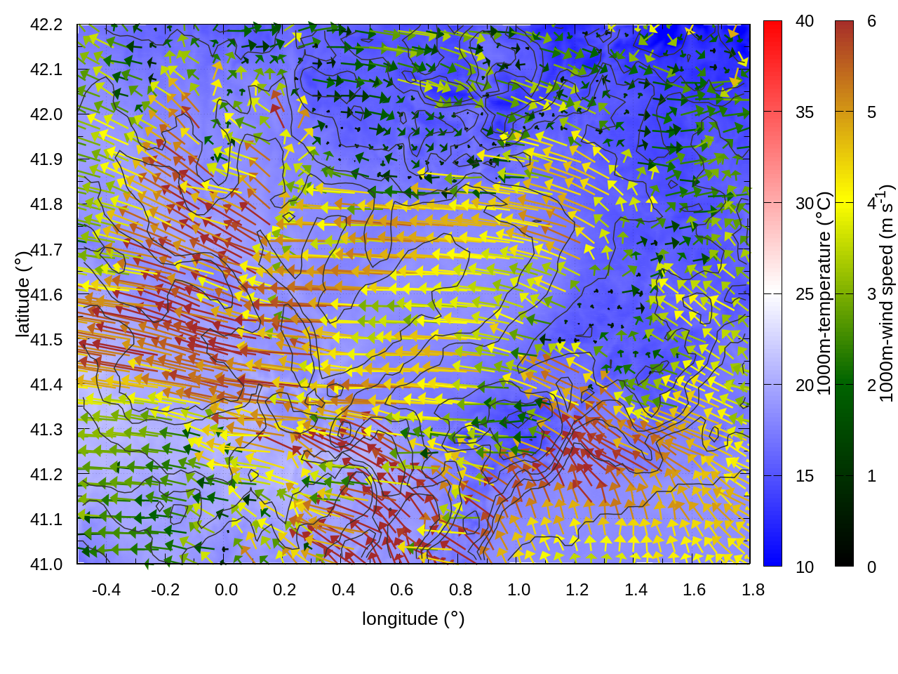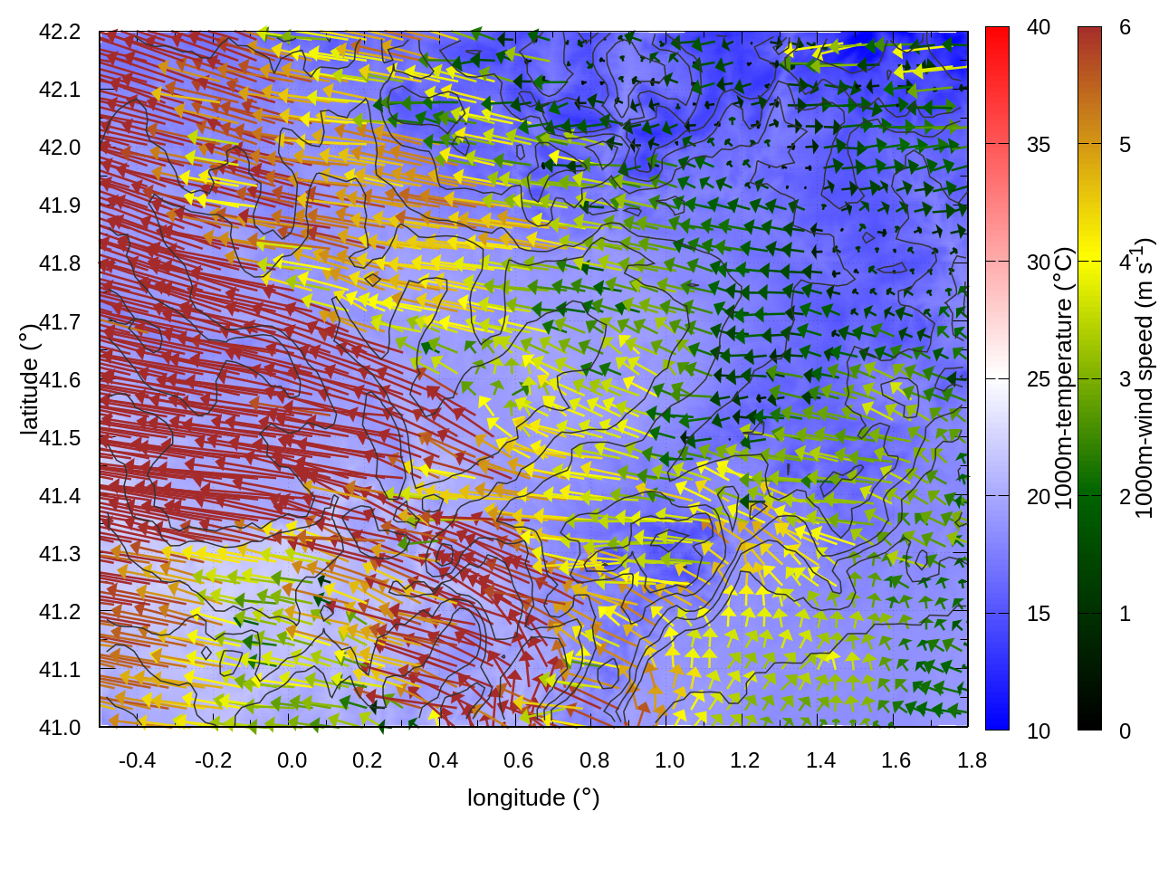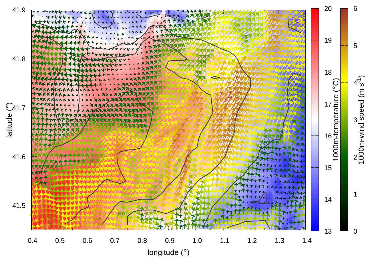 RIGHT: zoom over the region of interest (1 arrow every 3 gridpoints, about 1.2km x 1.2 km resolution)