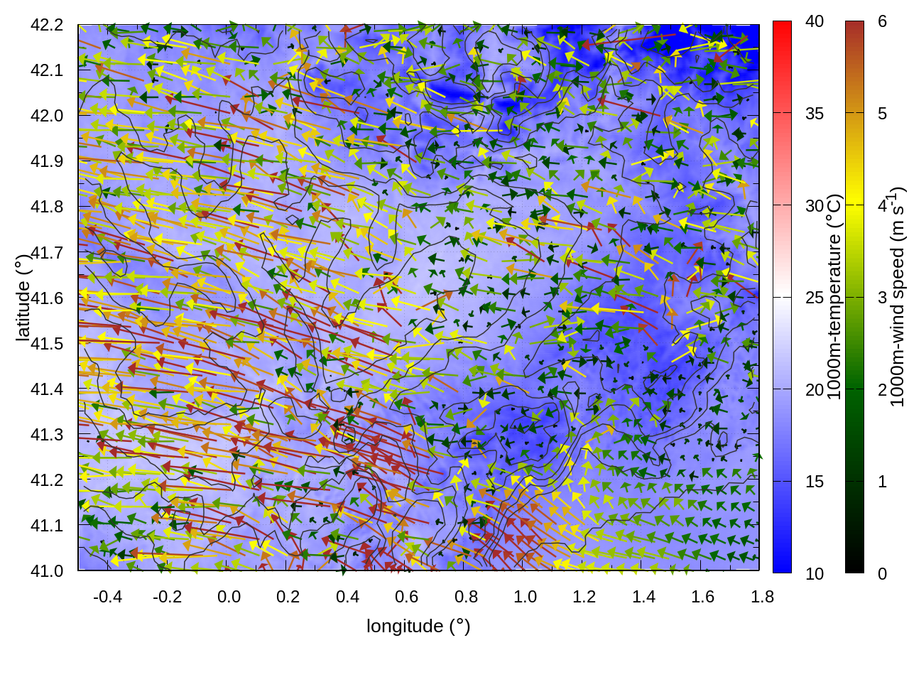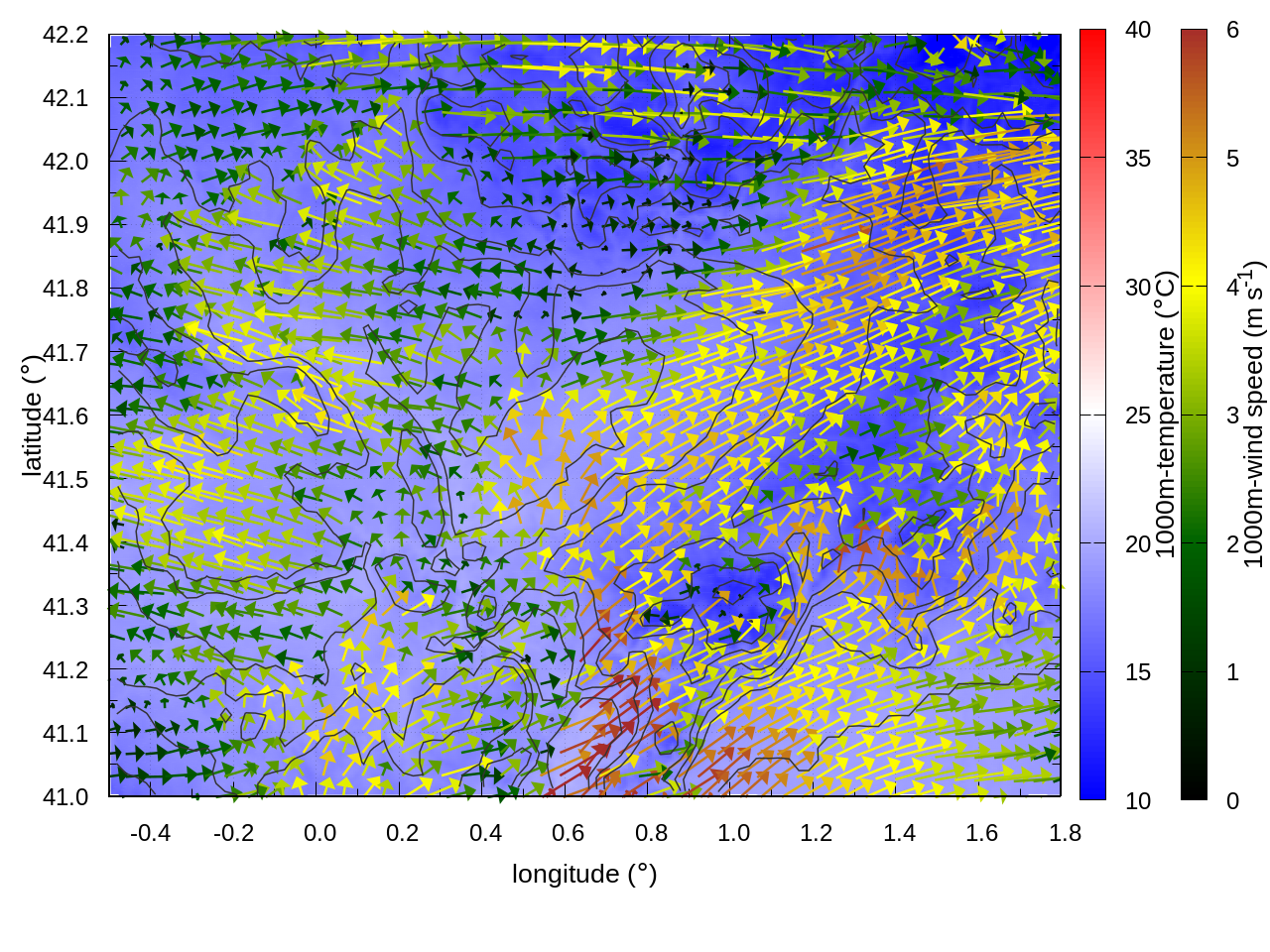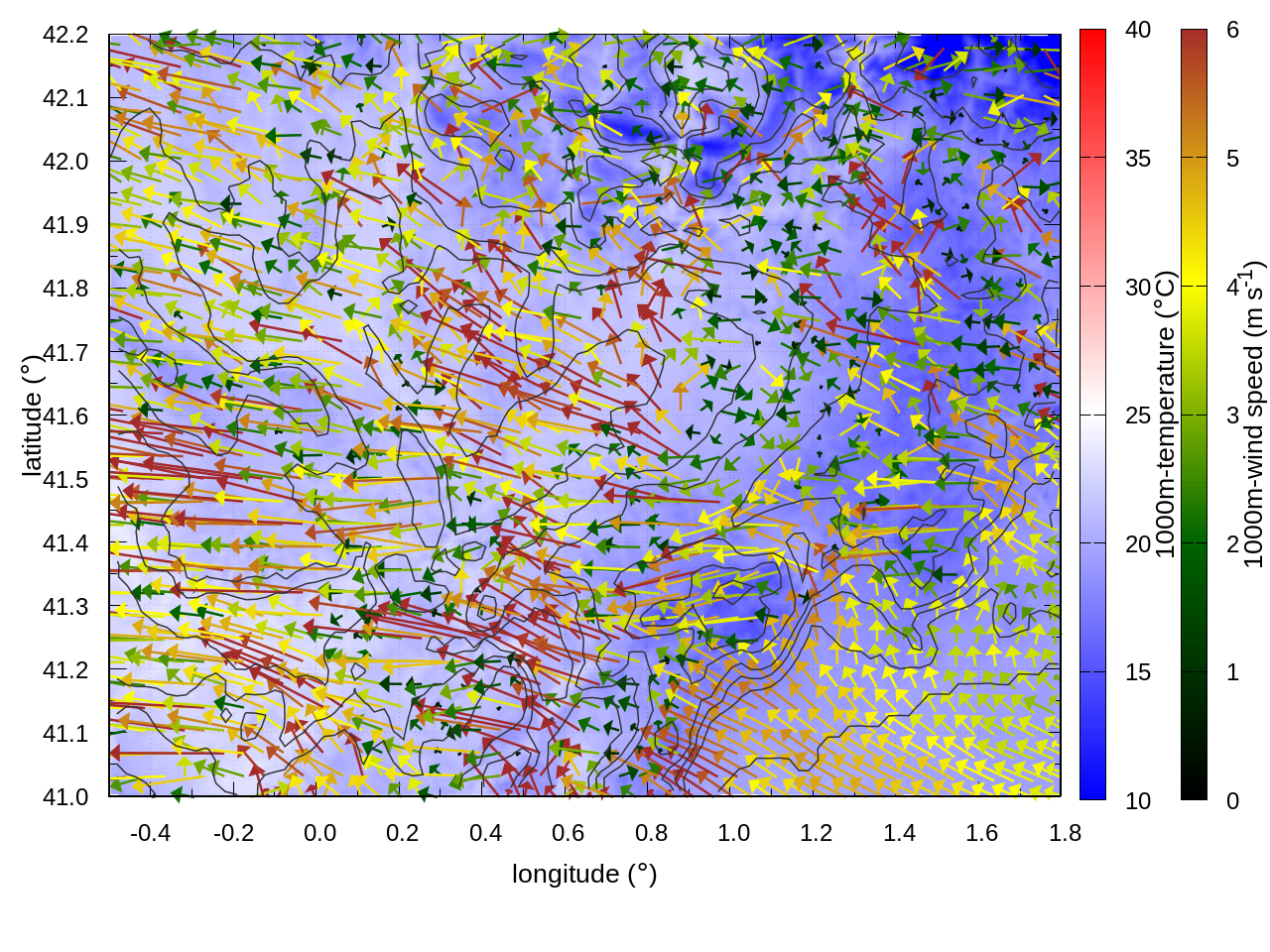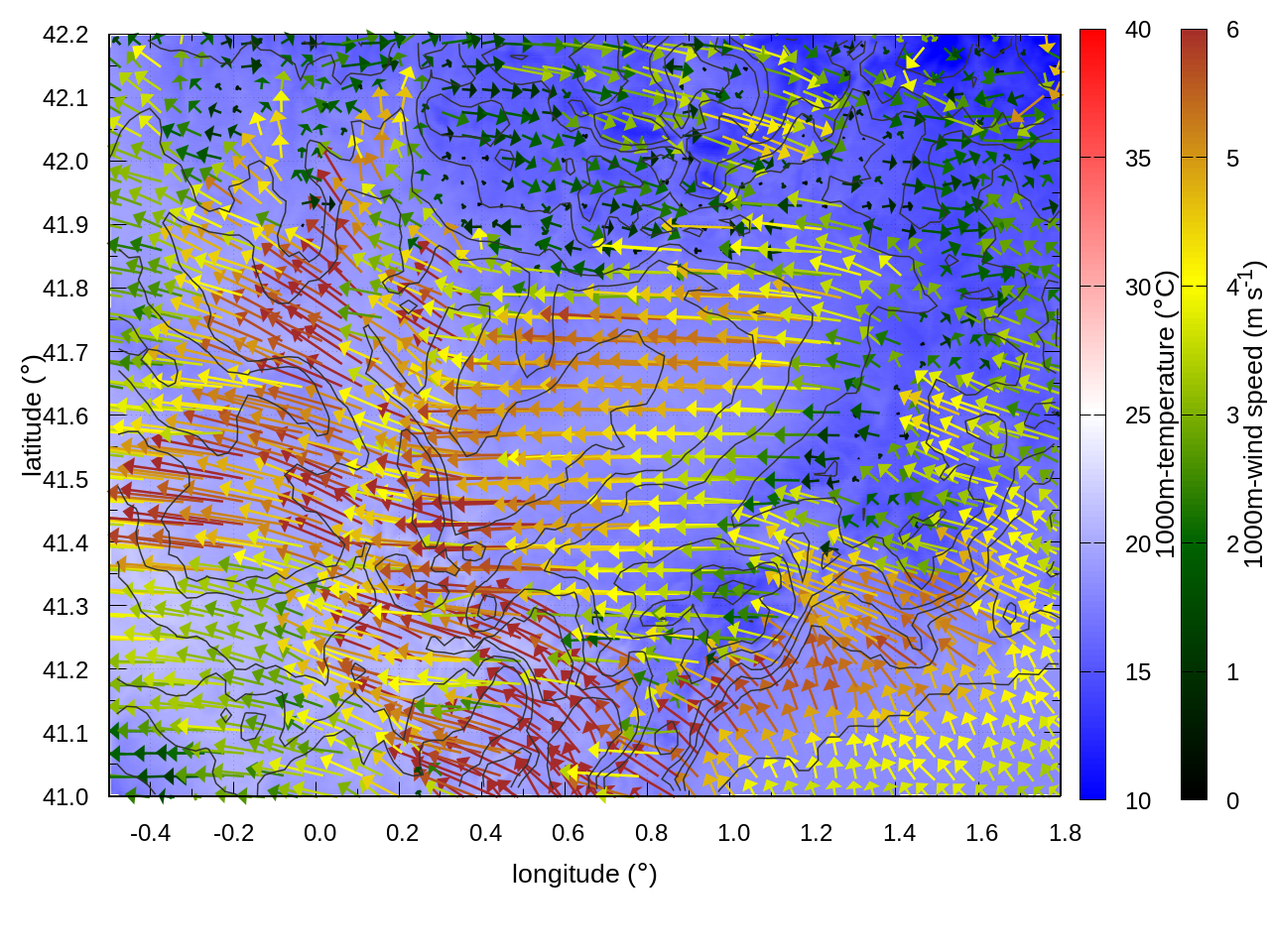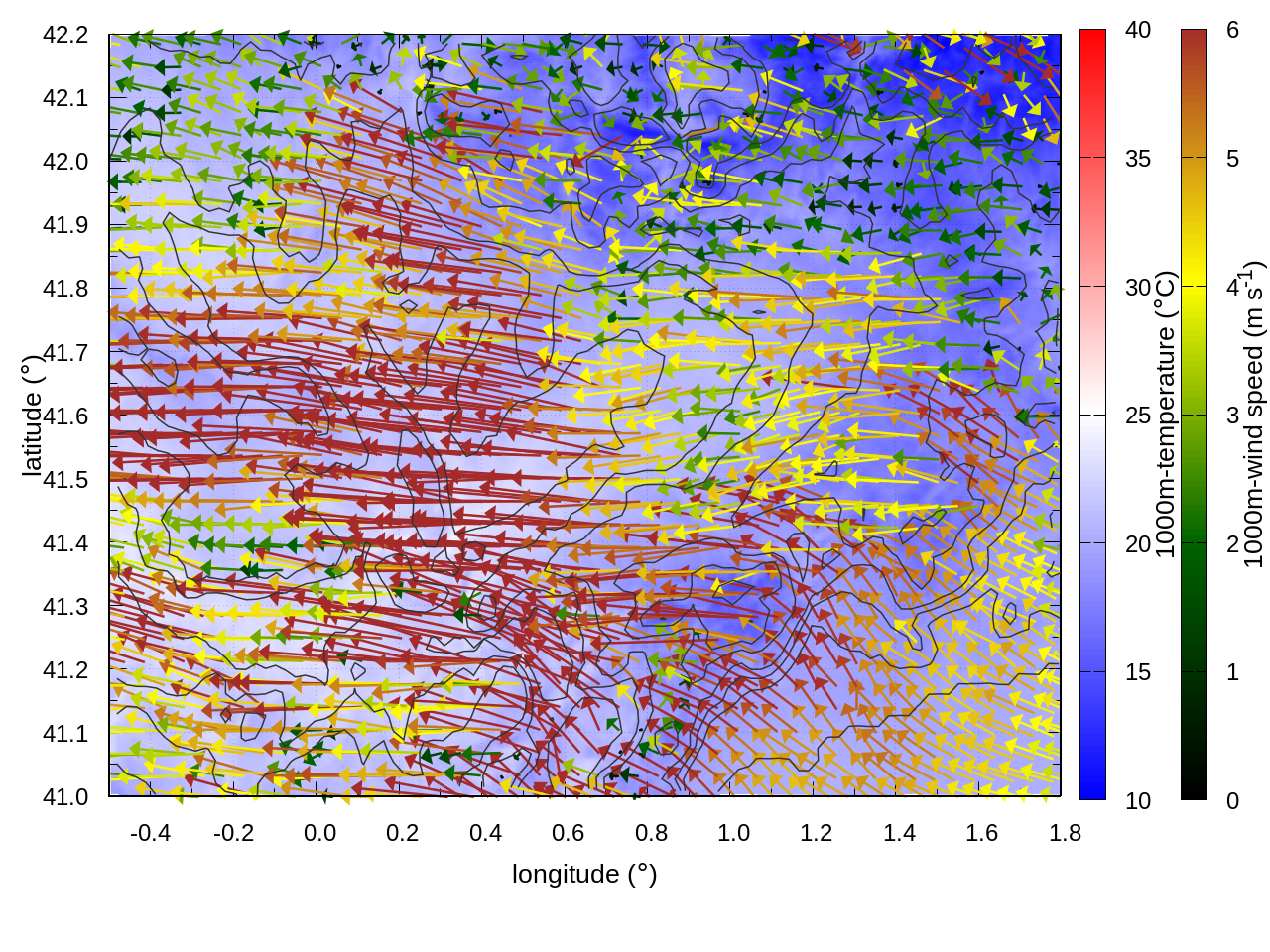 RIGHT: zoom over the region of interest (1 arrow every 3 gridpoints, about 1.2km x 1.2 km resolution)
