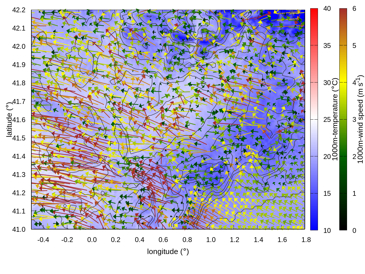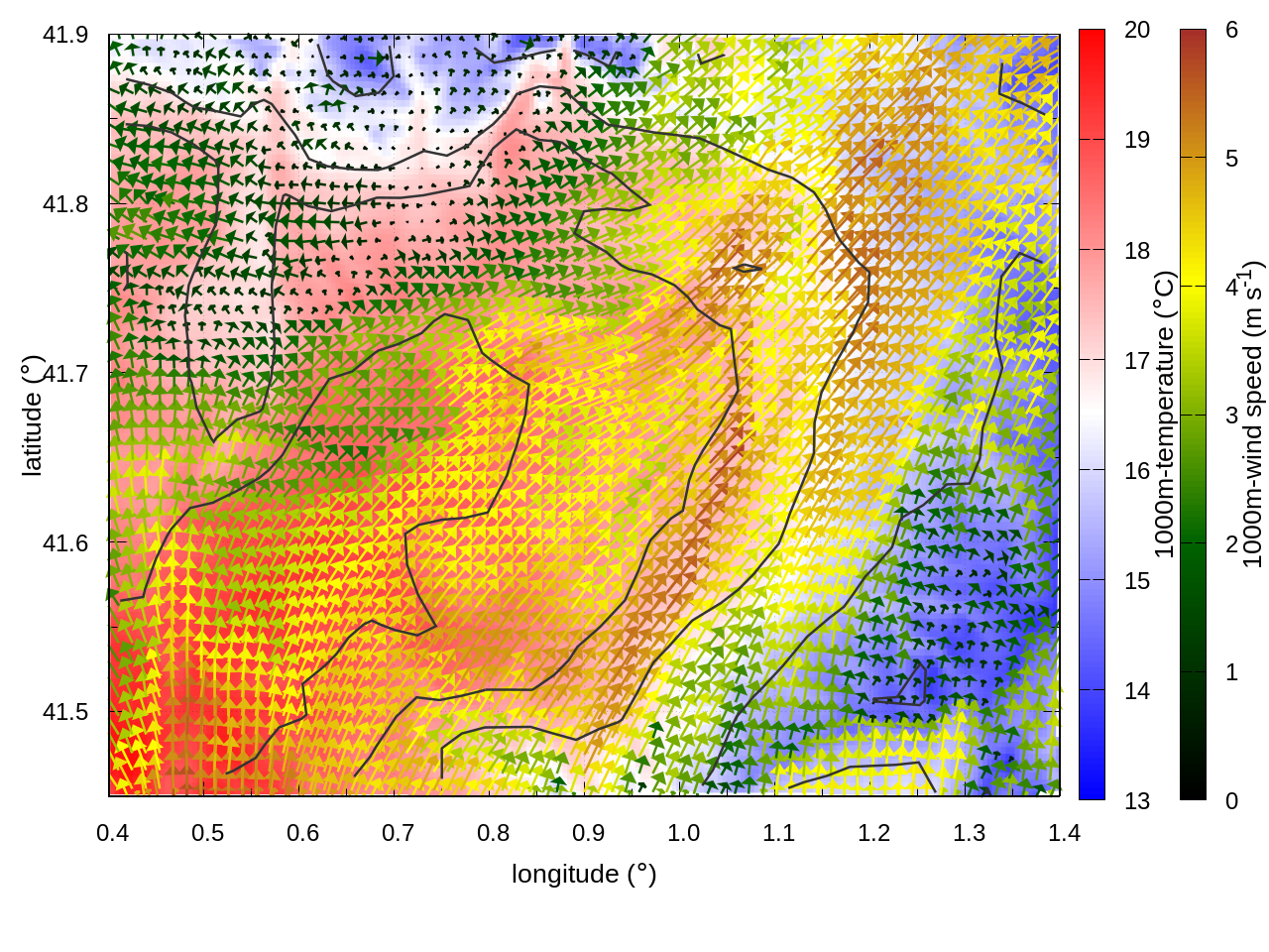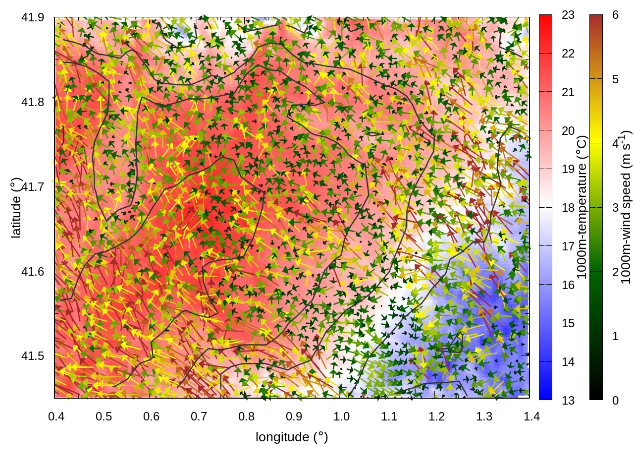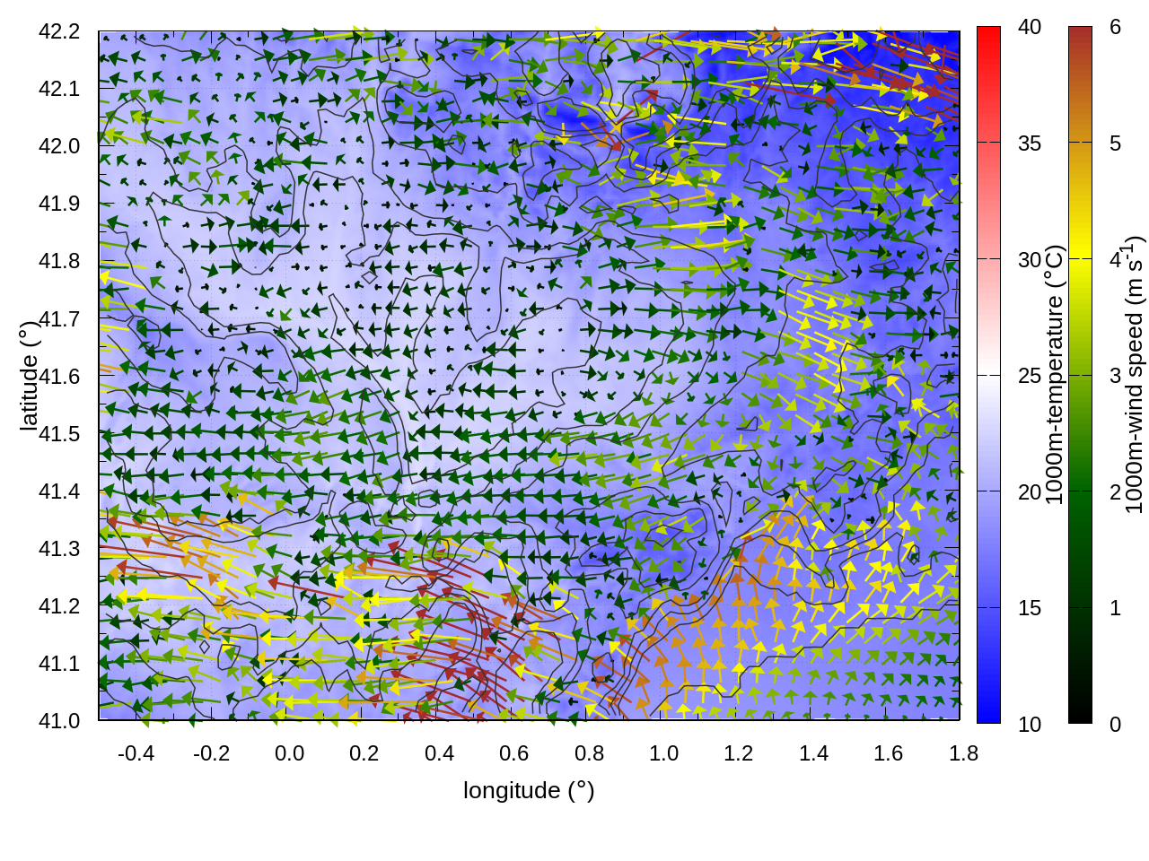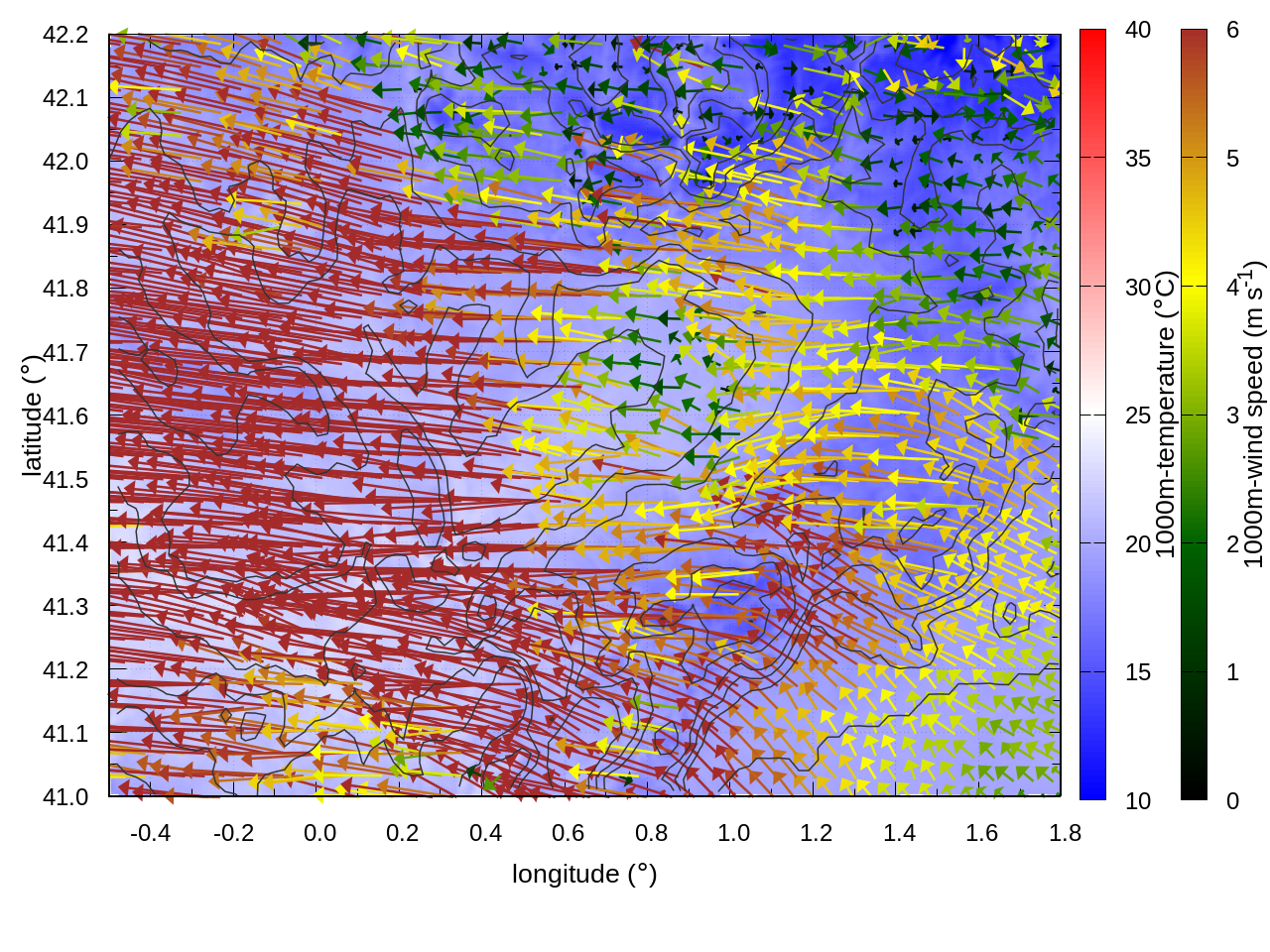 RIGHT: zoom over the region of interest (1 arrow every 3 gridpoints, about 1.2km x 1.2 km resolution)