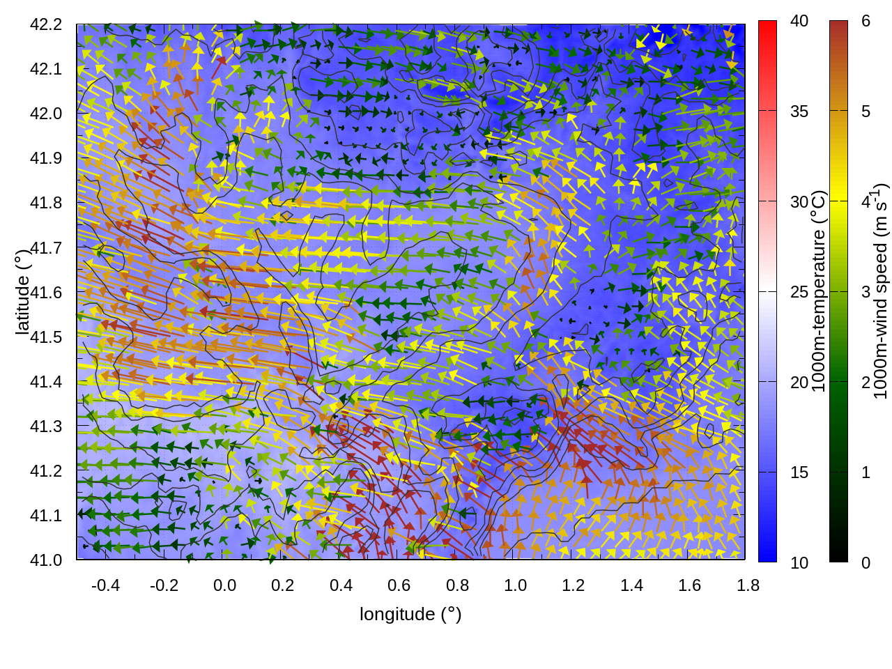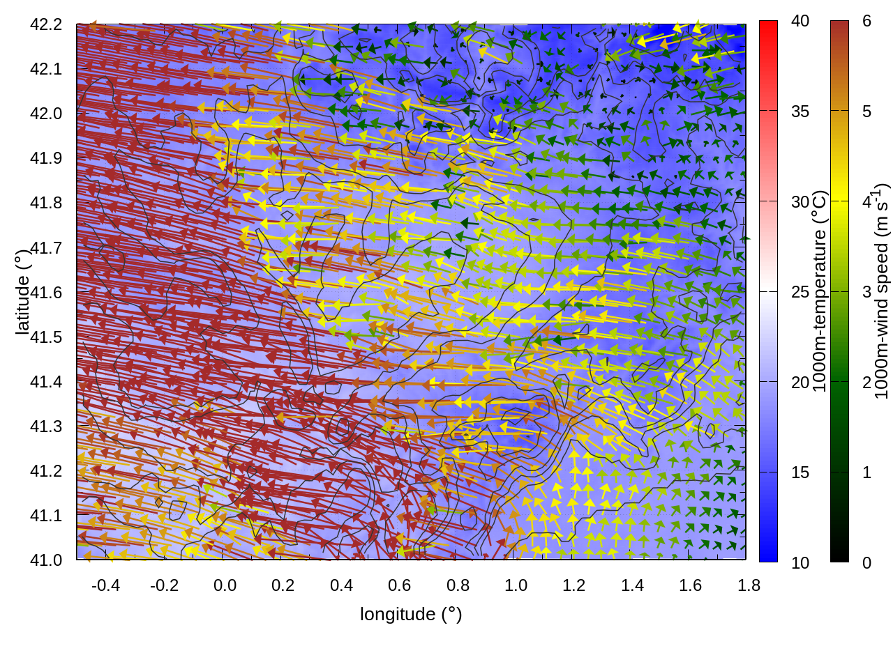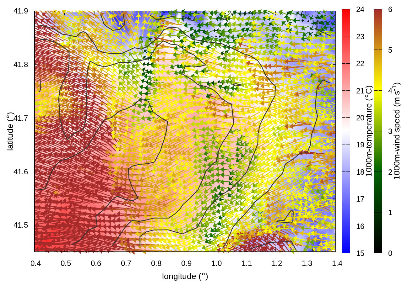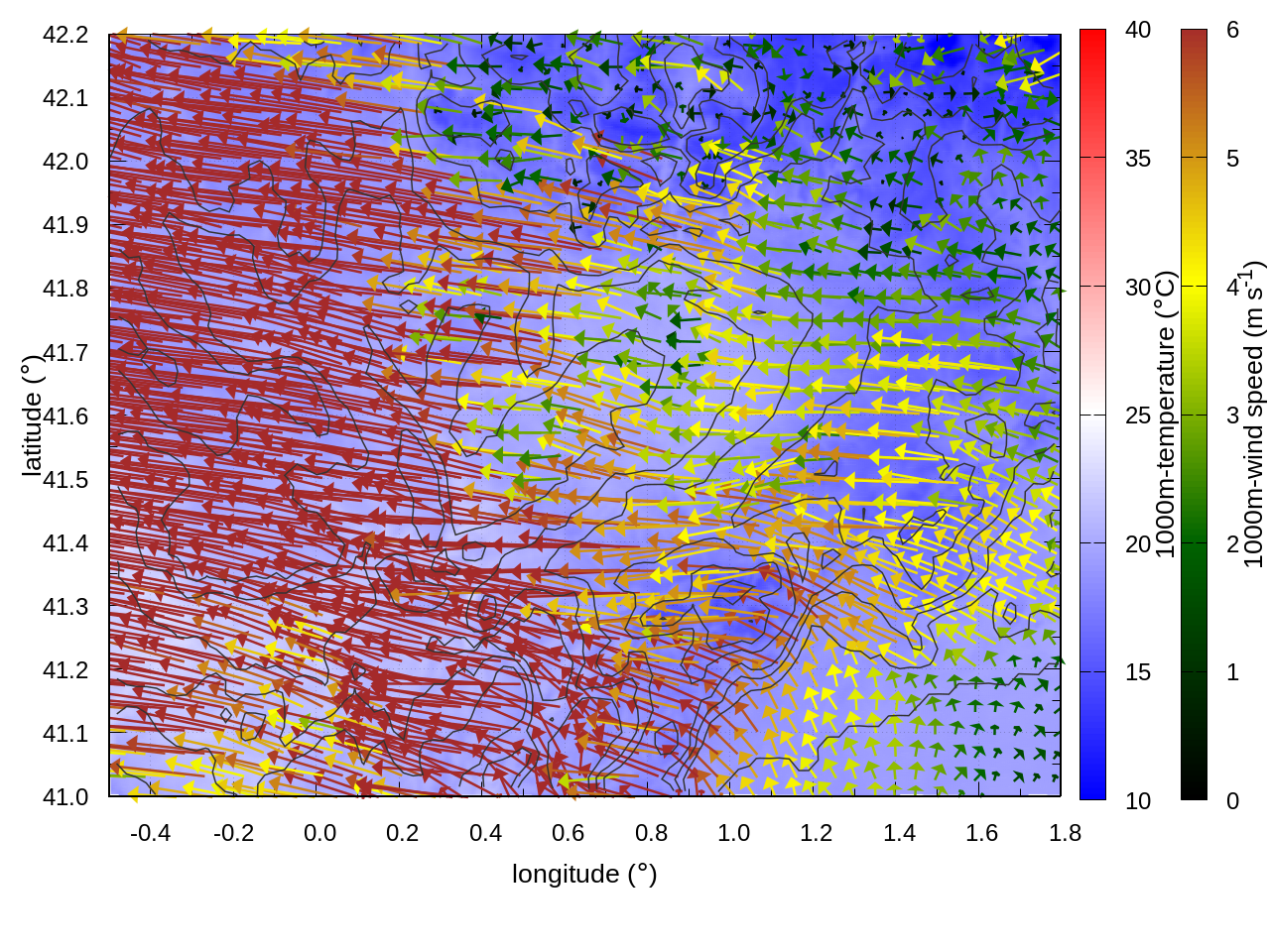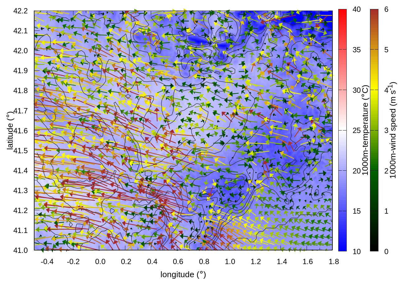 RIGHT: zoom over the region of interest (1 arrow every 3 gridpoints, about 1.2km x 1.2 km resolution)