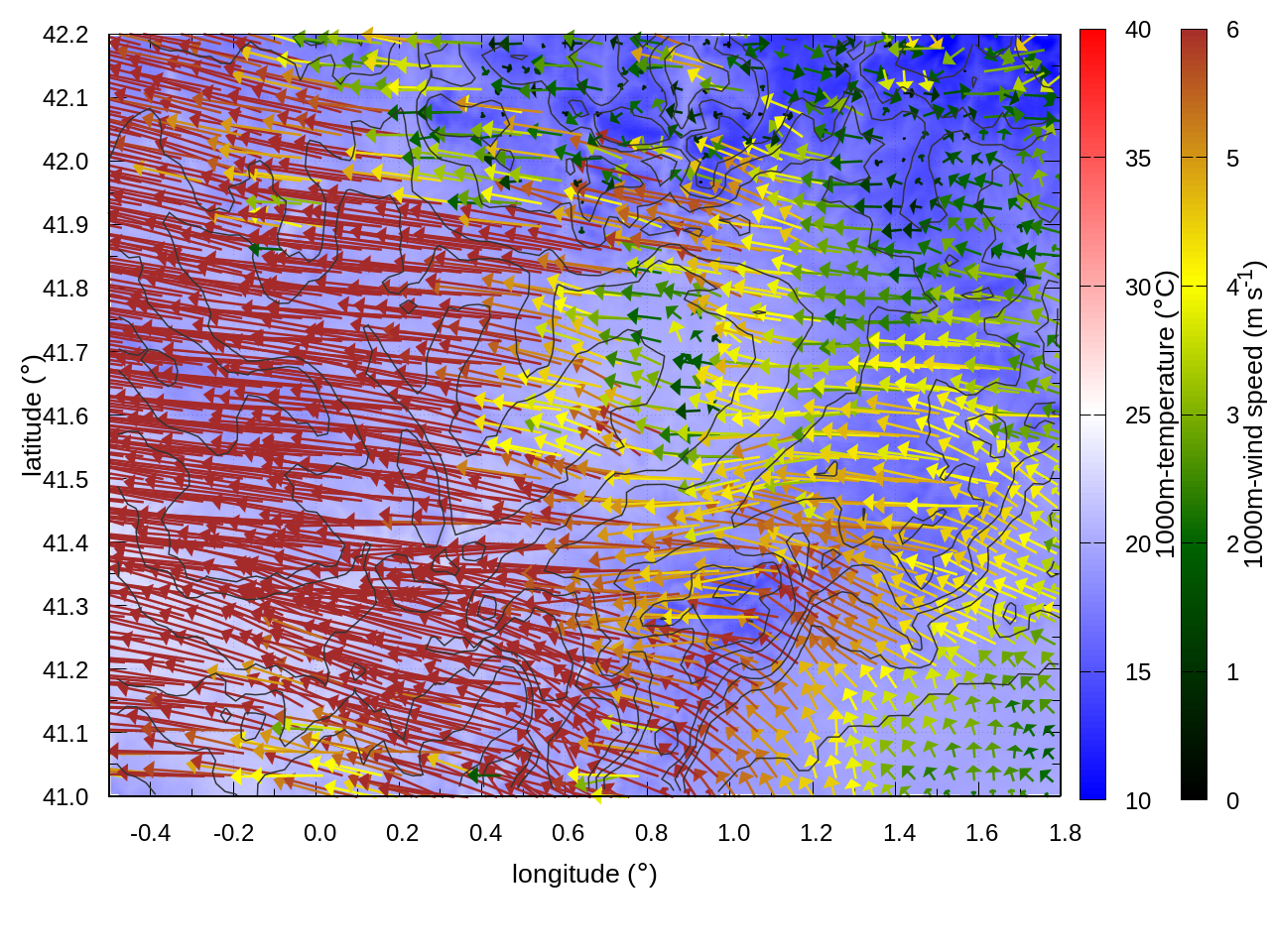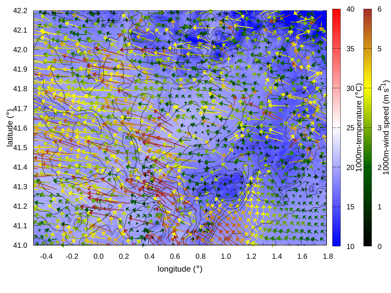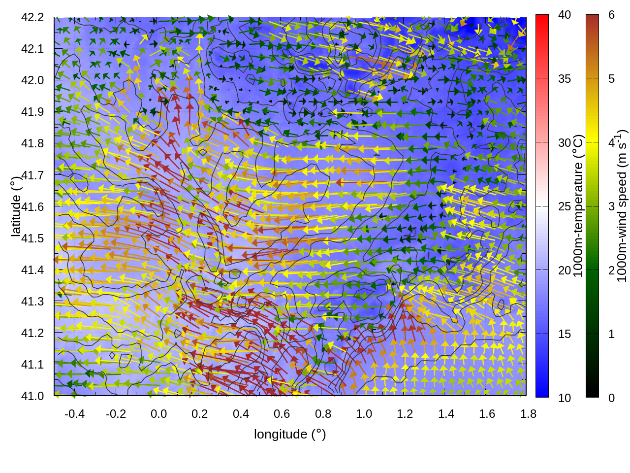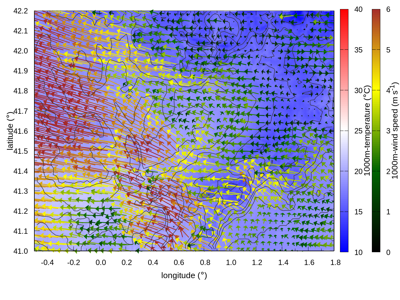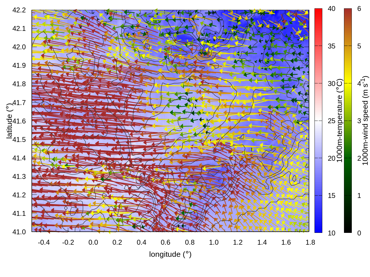 RIGHT: zoom over the region of interest (1 arrow every 3 gridpoints, about 1.2km x 1.2 km resolution)