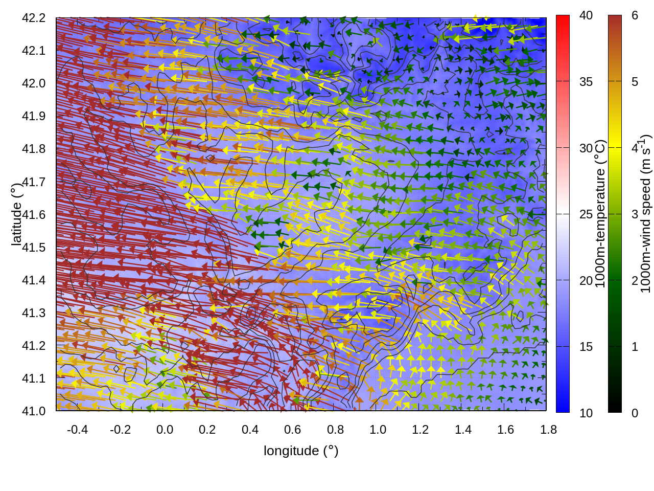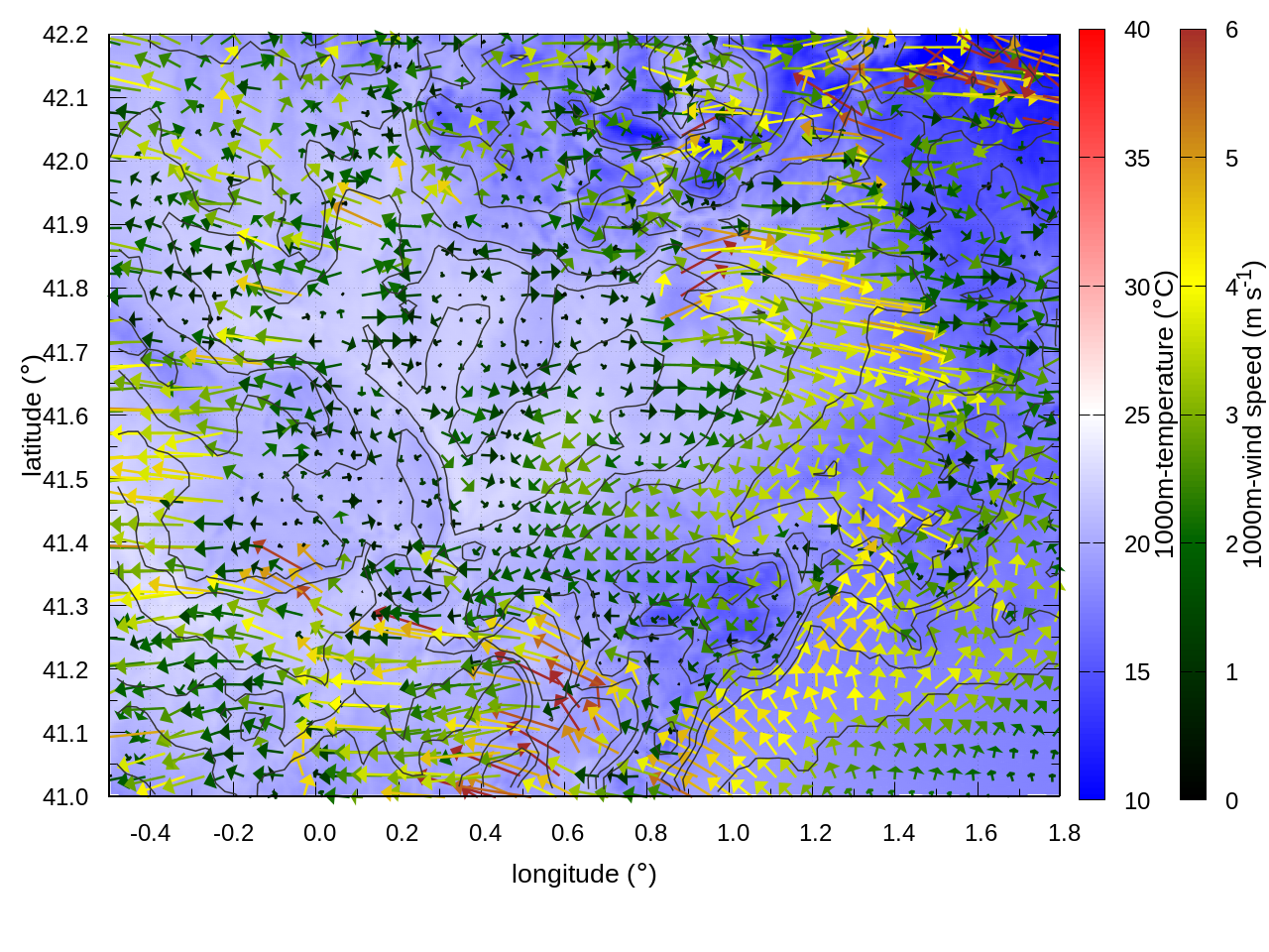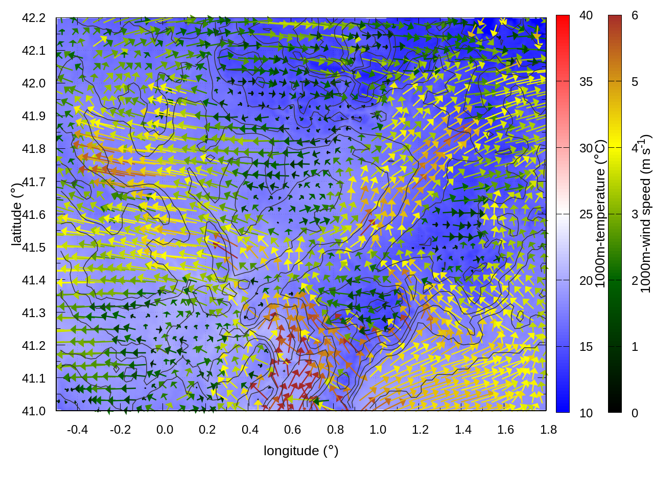 LEFT: inner domain (1 arrow every 10 grid points, about 4km x 4km resolution)