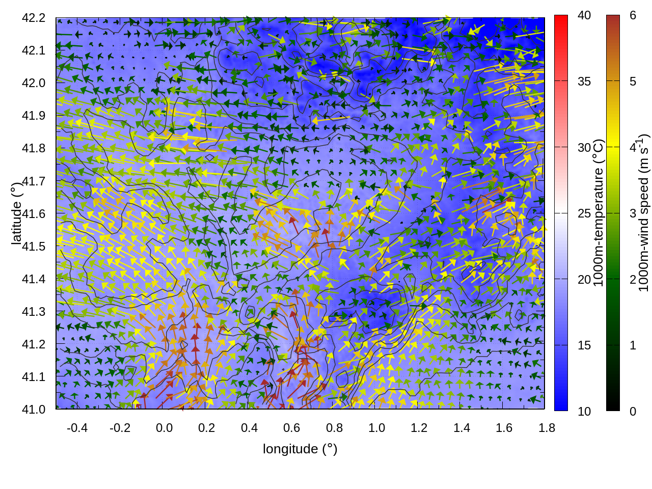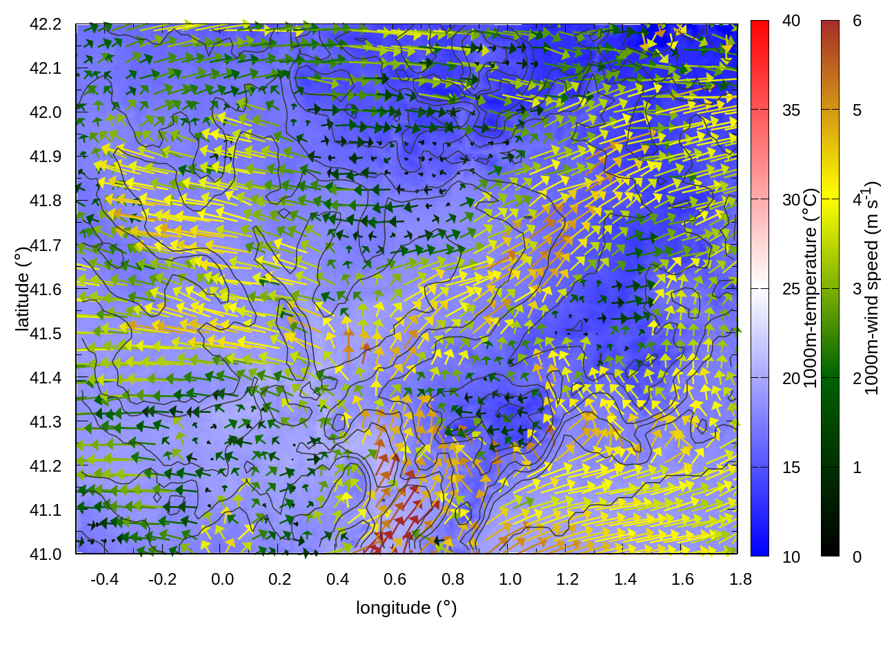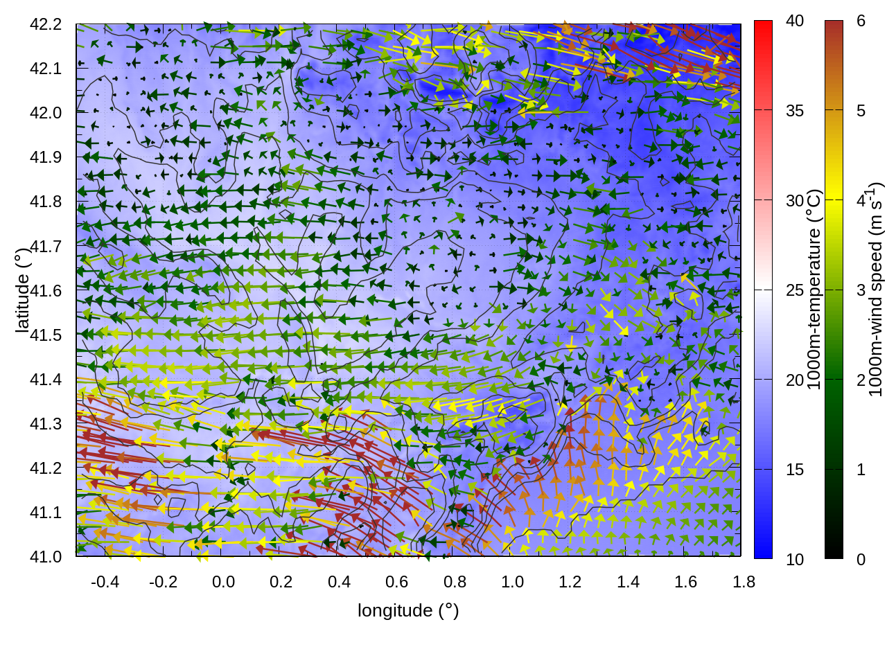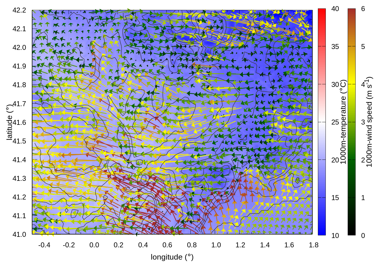 LEFT: inner domain (1 arrow every 10 grid points, about 4km x 4km resolution)